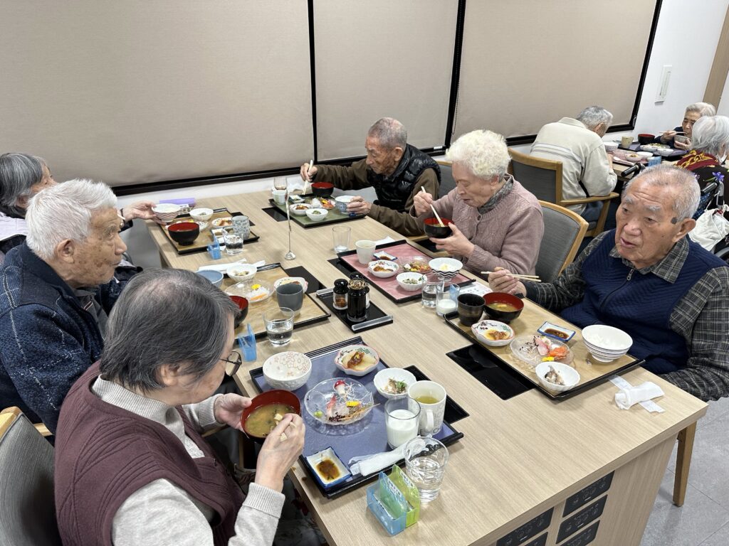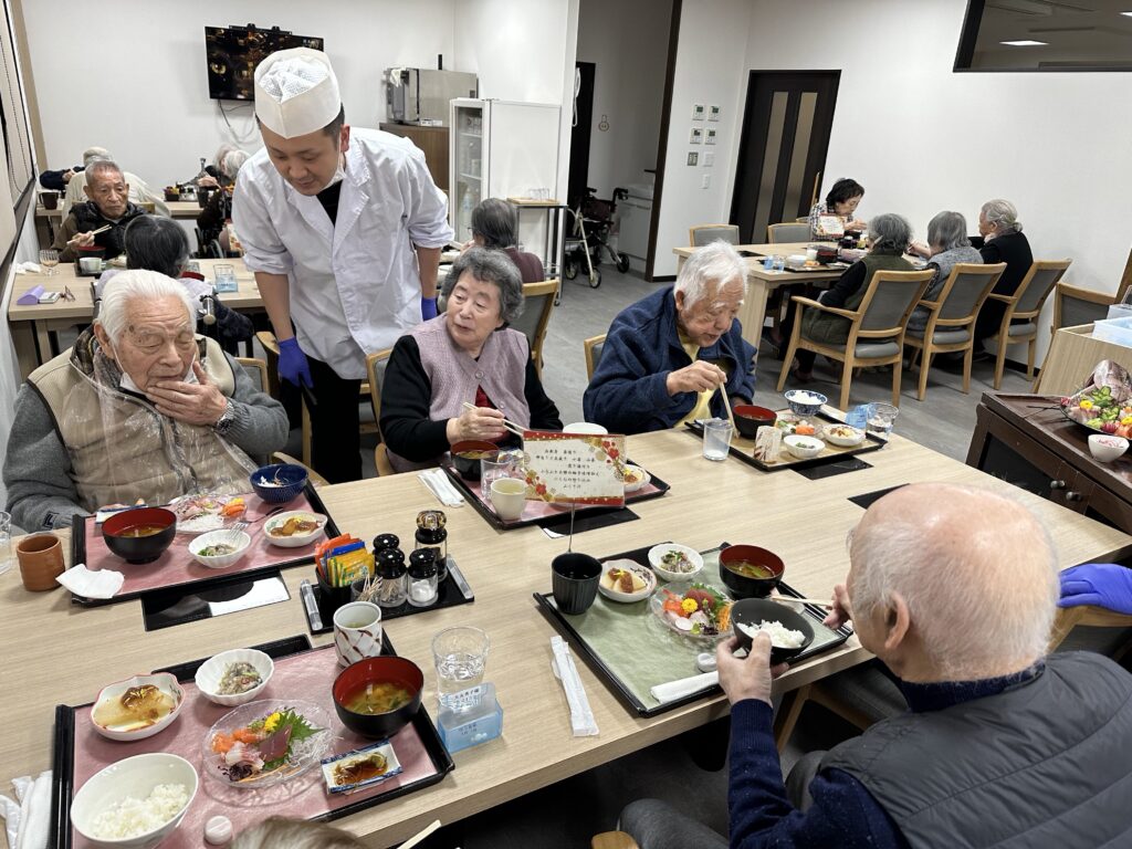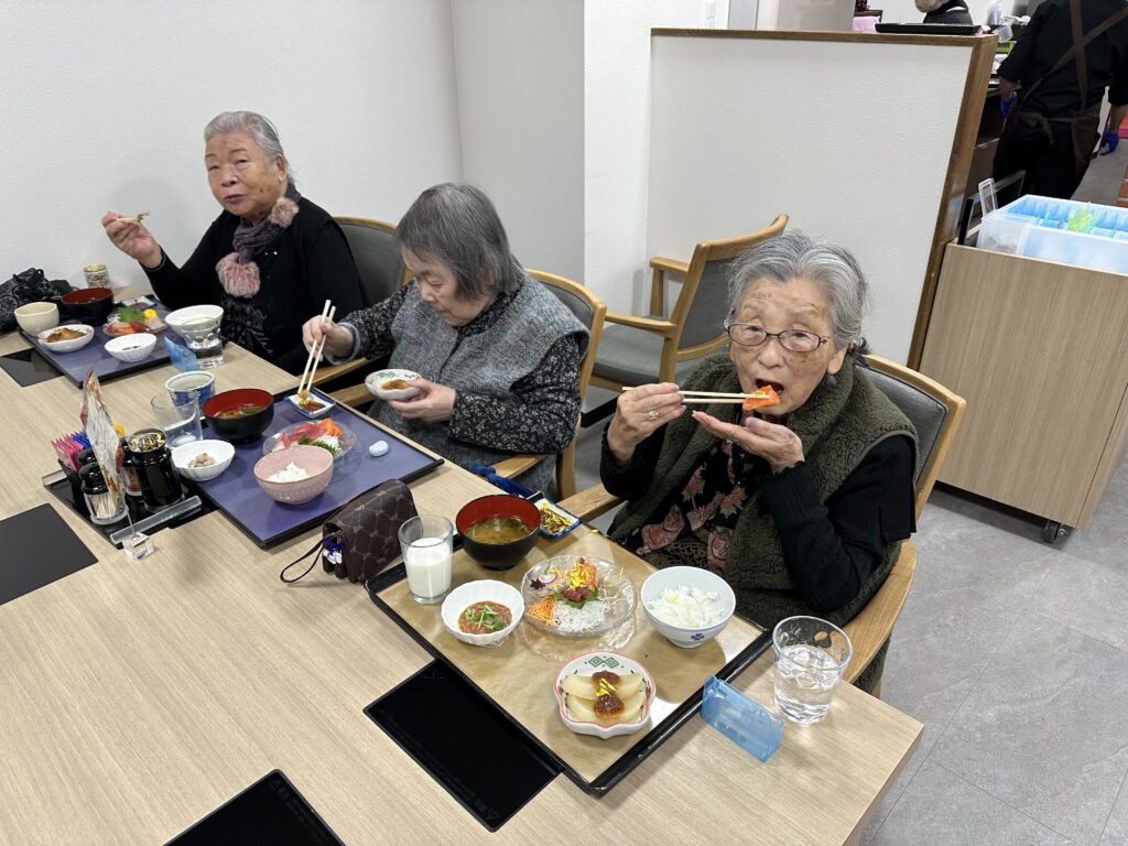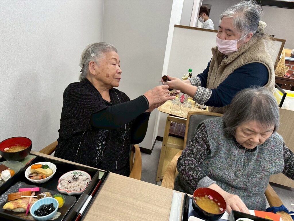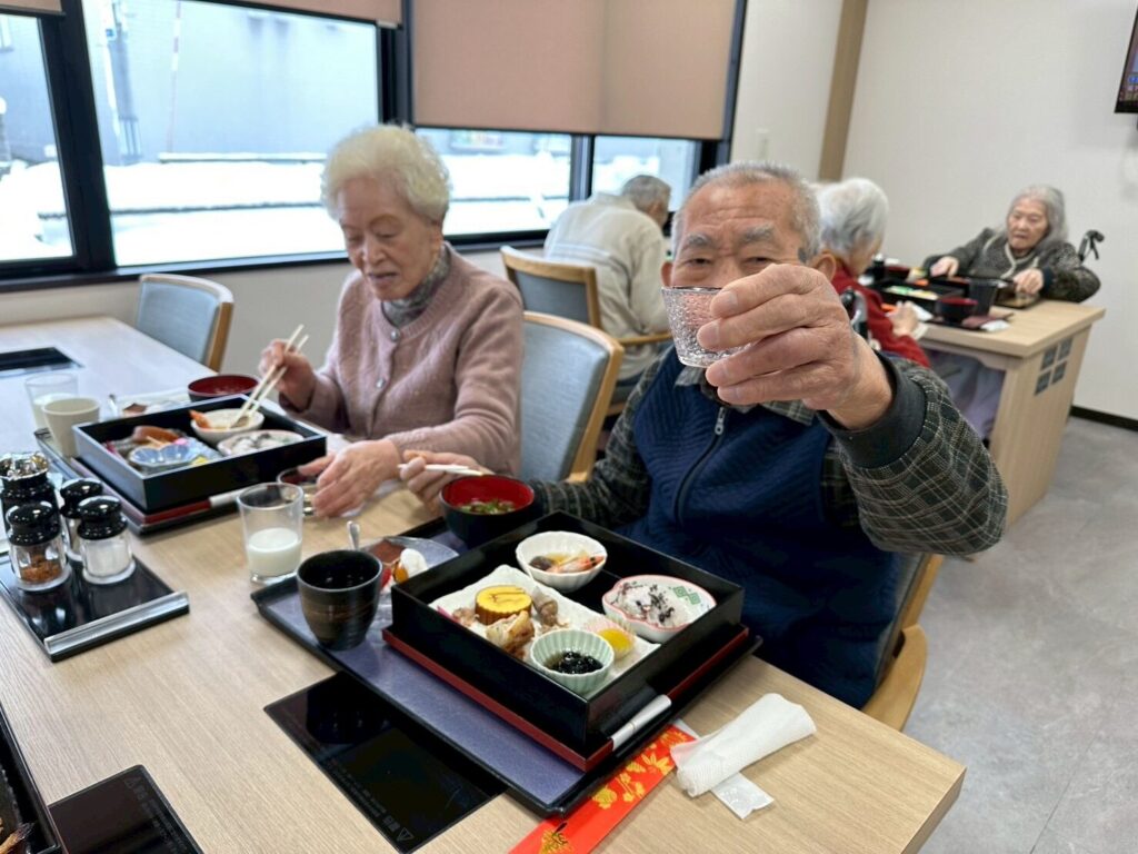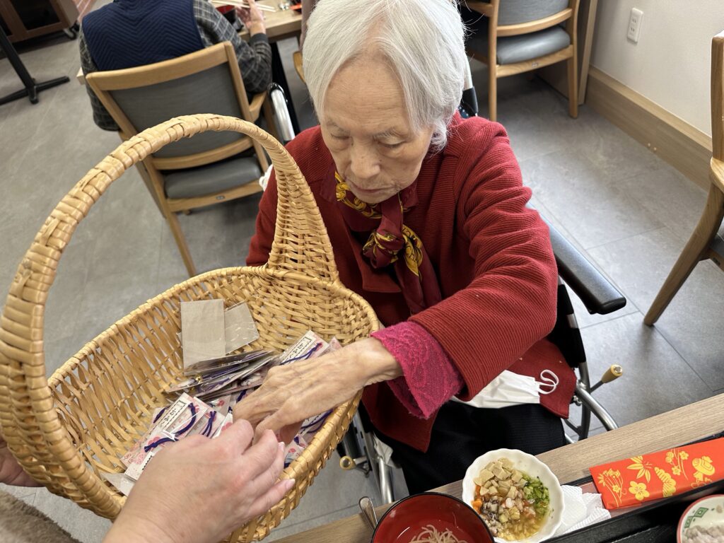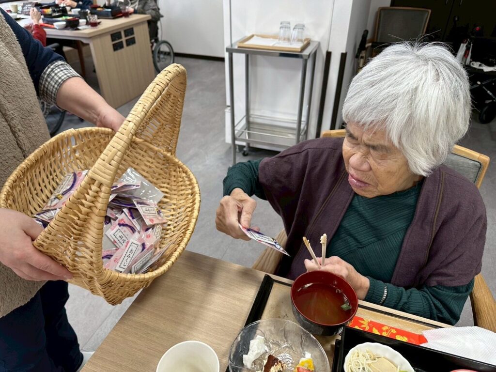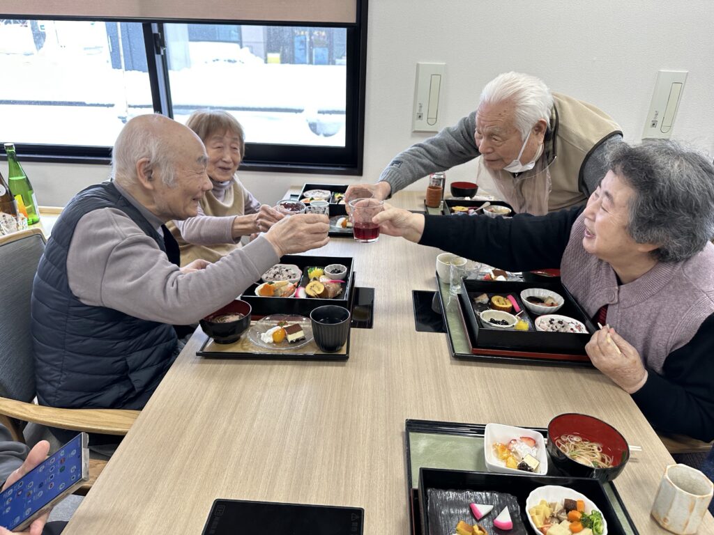 普段お酒を飲まないご利用者さんも「せっかくだから今日は飲もうかな?」と他の方と乾杯をされたり、「あら、私大吉が出たわよ❤️」など、笑顔の絶えない昼食となりました😊