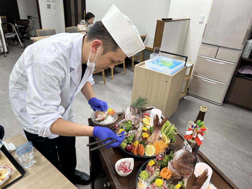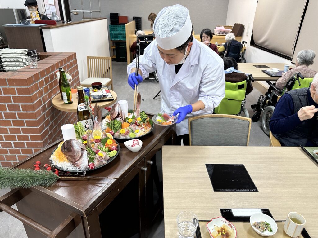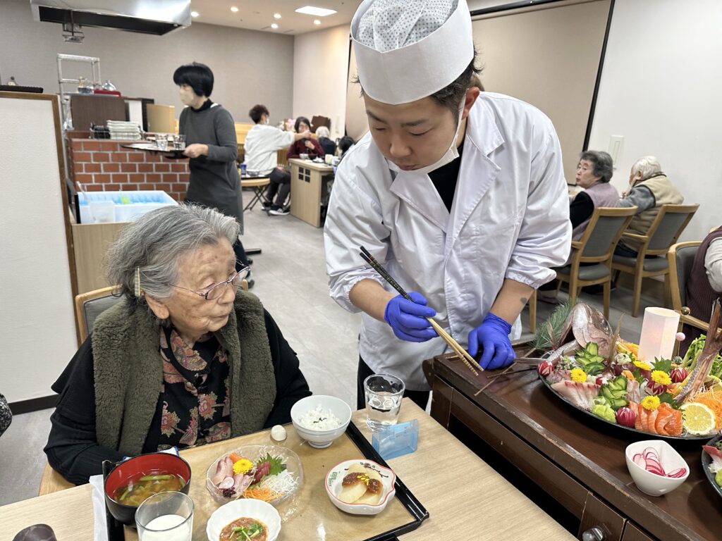 お食事が始まったあとは厨房の竹沢パートナーと山田パートナーが各テーブルを回り、ご希望の刺身を追加でご提供🐟