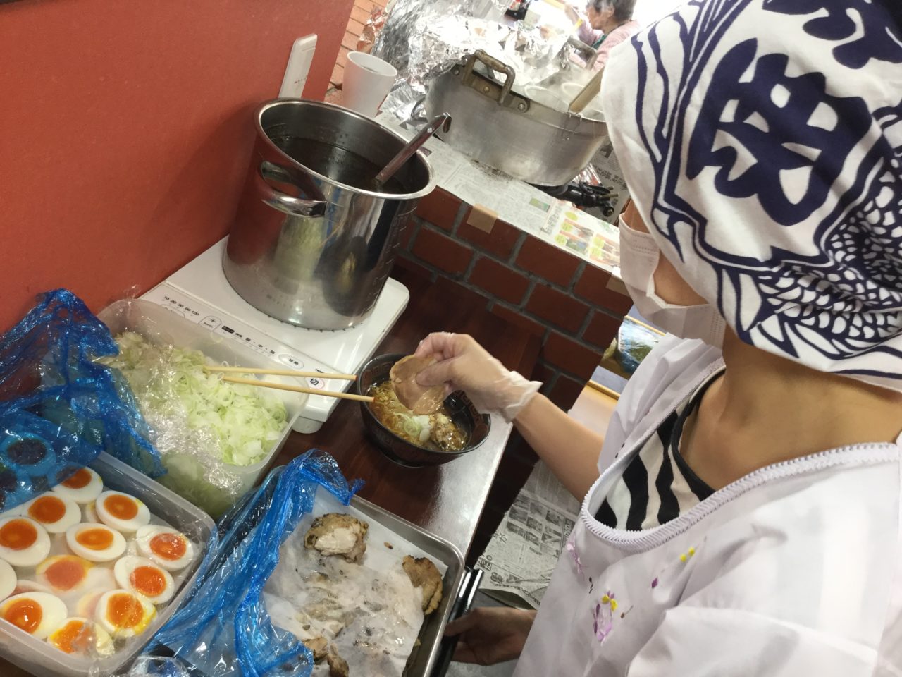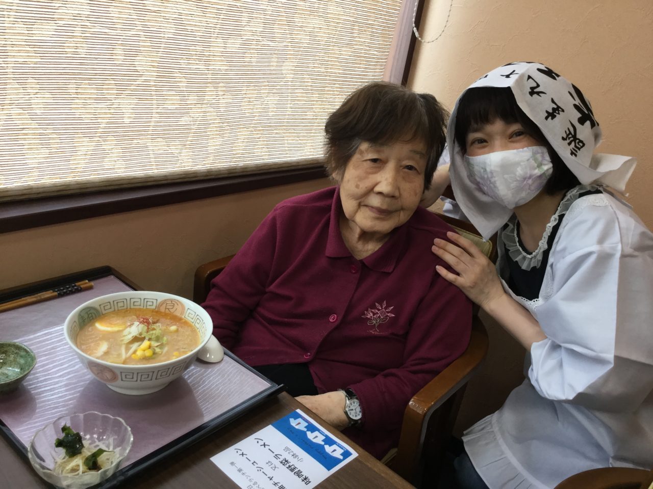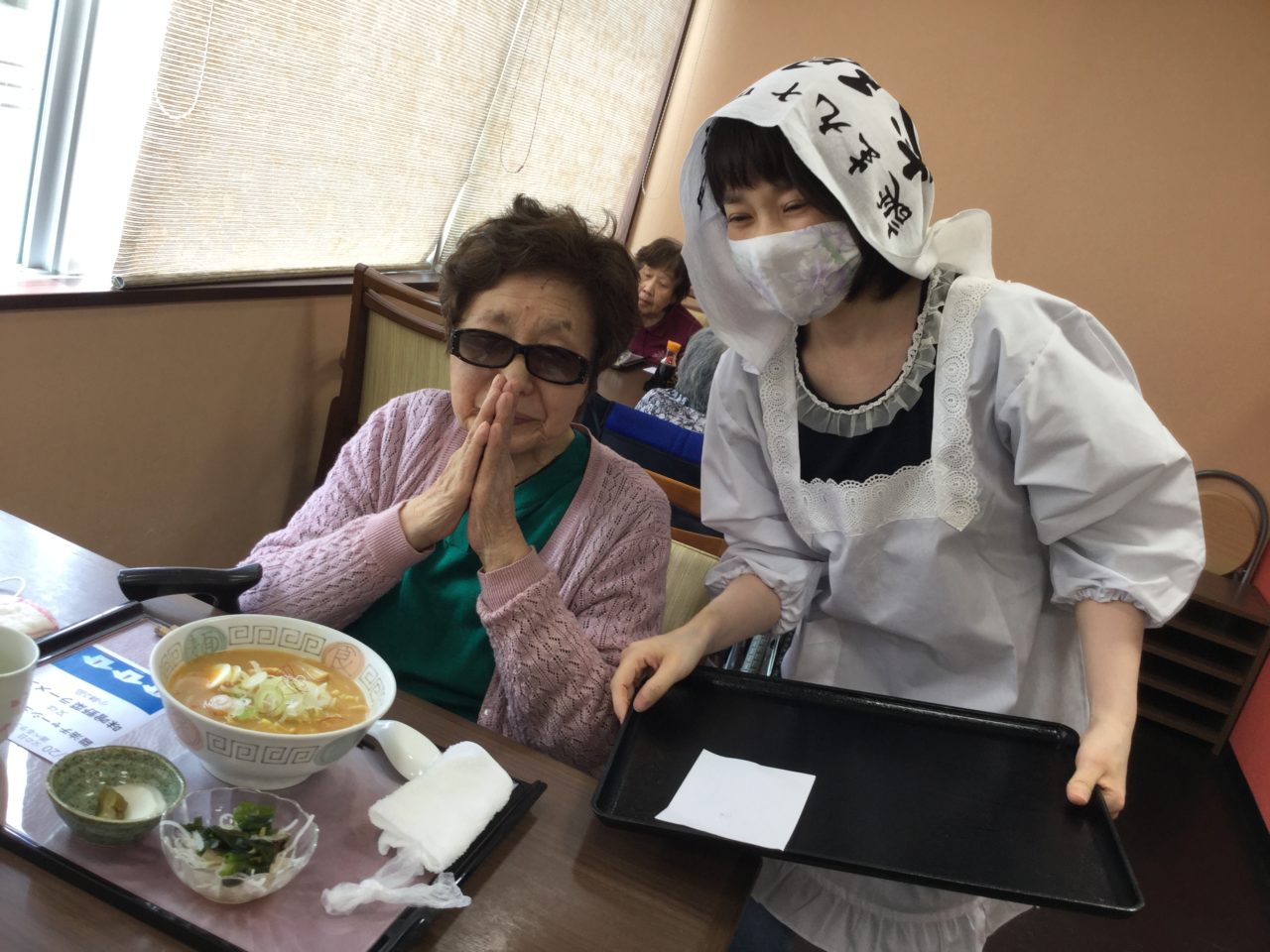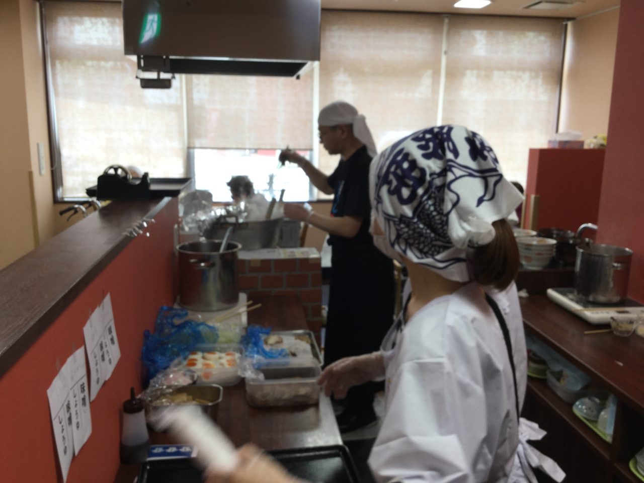 さて、横手のあば達、注文をとったらラーメン屋の店主に伝え、運ぶミッション開始です!!とその前に割烹着が縦結びだよと笑いながらMさんに直してもらっています?