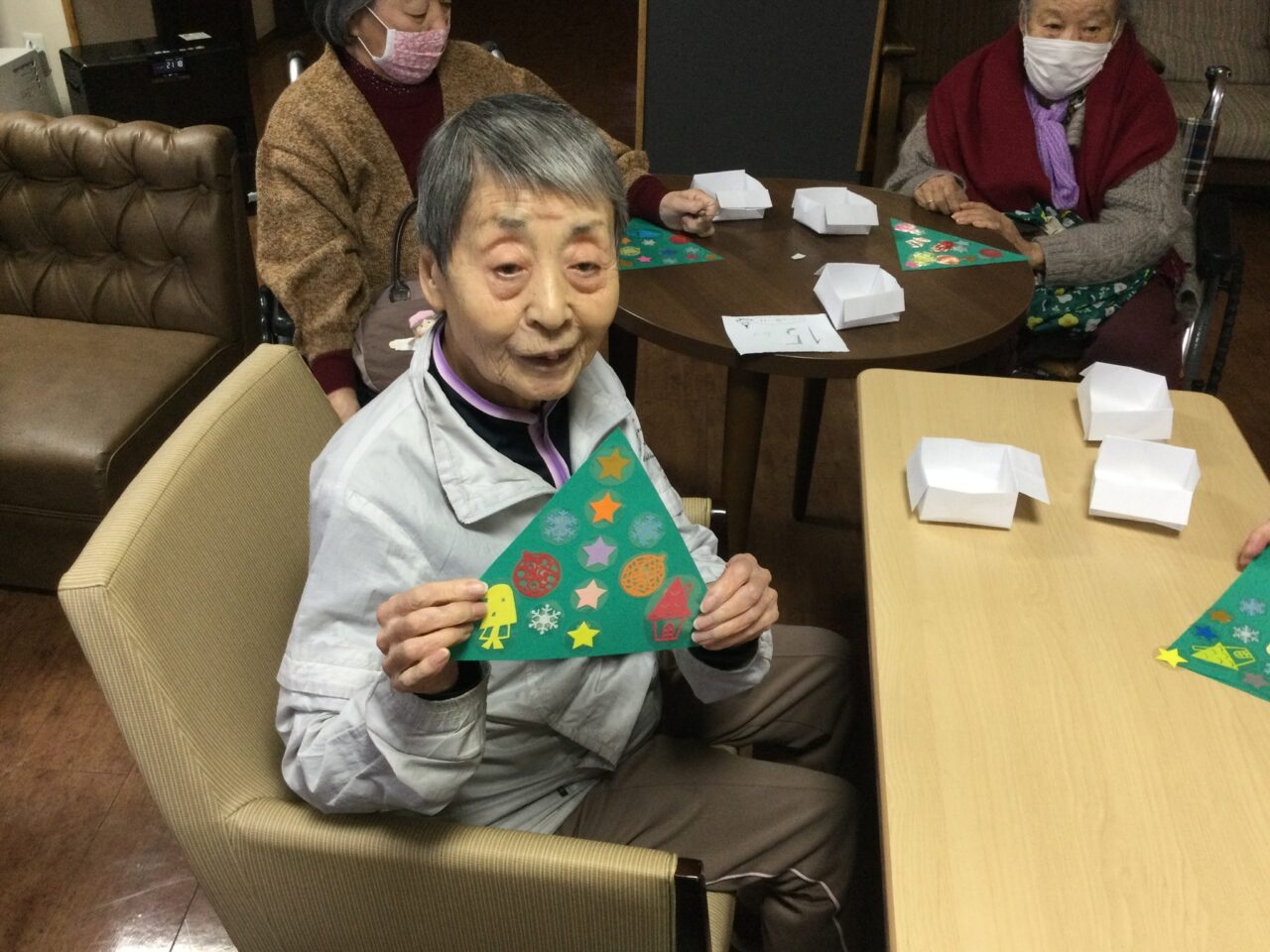 皆さん三角の色画用紙に何やら飾りを貼っております❗️