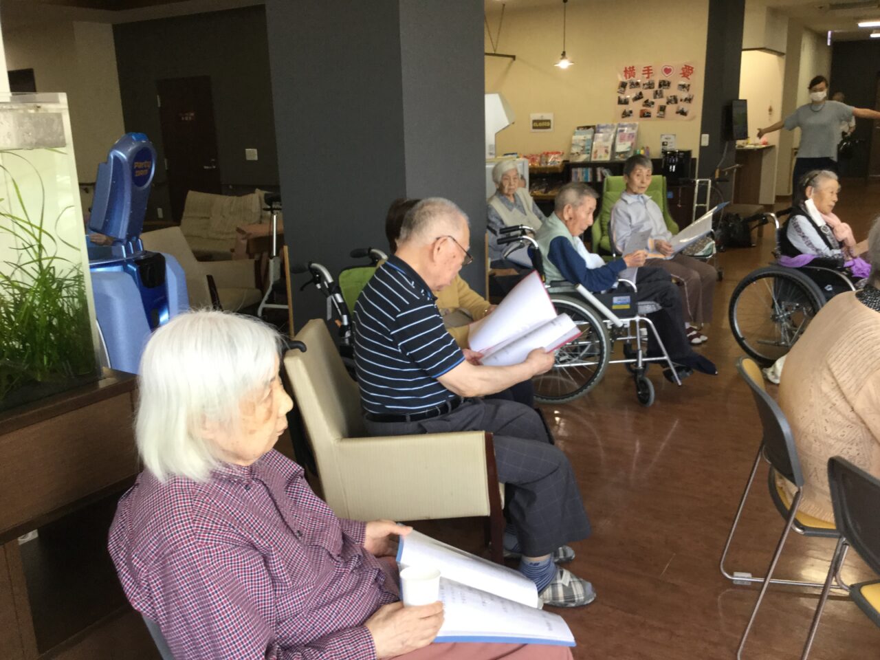 ロビーでは…田代パートナーが何やら準備をしているかと思ったらピンポンパンポーン?「ロビーにて歌と体操を行いましょう。」