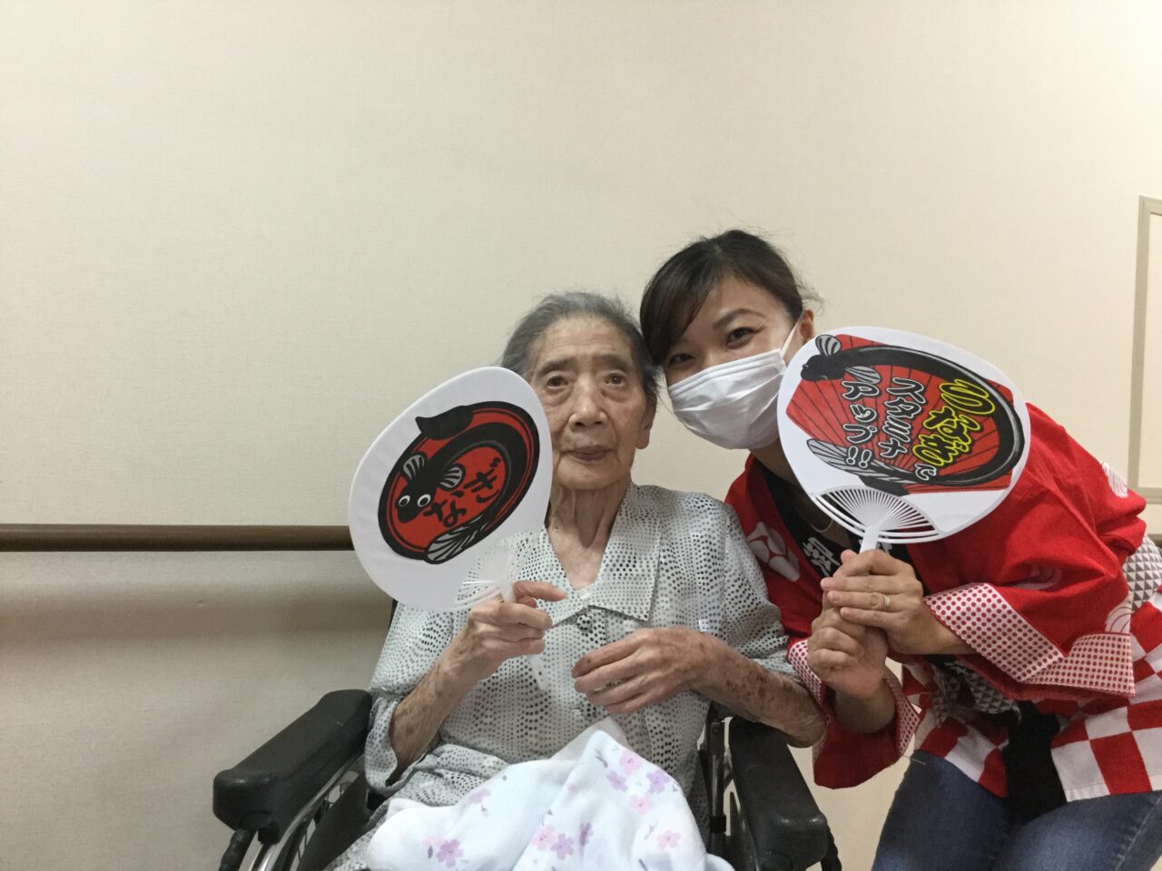 職員もハッピを着て気合が入ります!!団扇であおいでわっしょいわっしょい?記念撮影です?