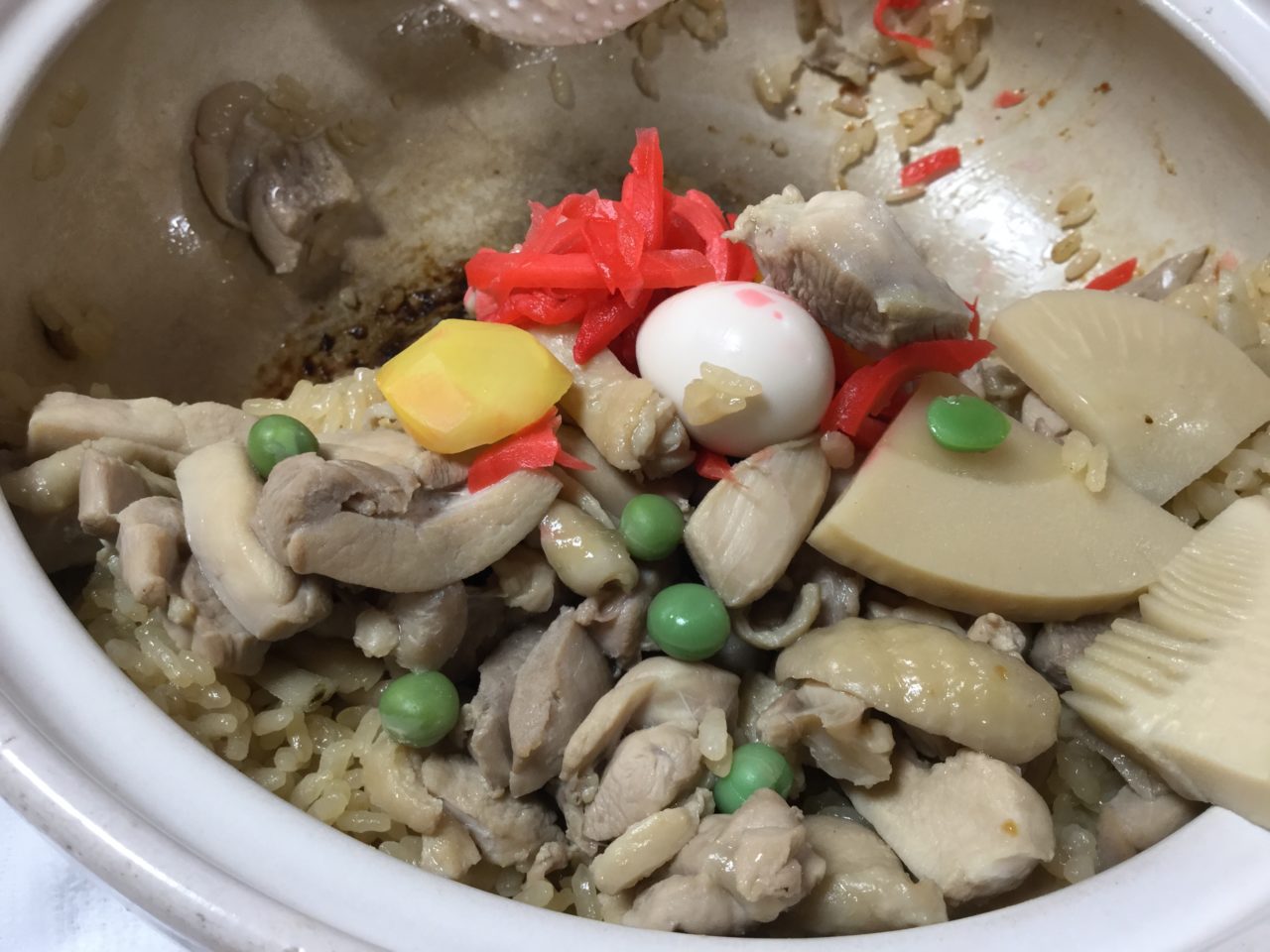 具は鶏肉、ささがき牛蒡、椎茸、うずらの卵、グリンピース、紅生姜、栗、杏らしいのですが…