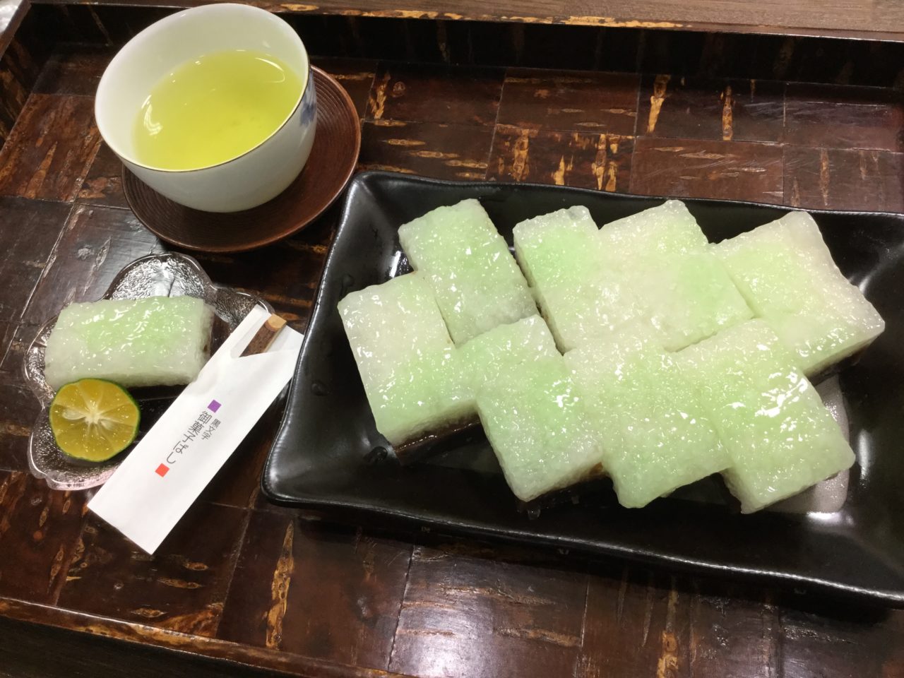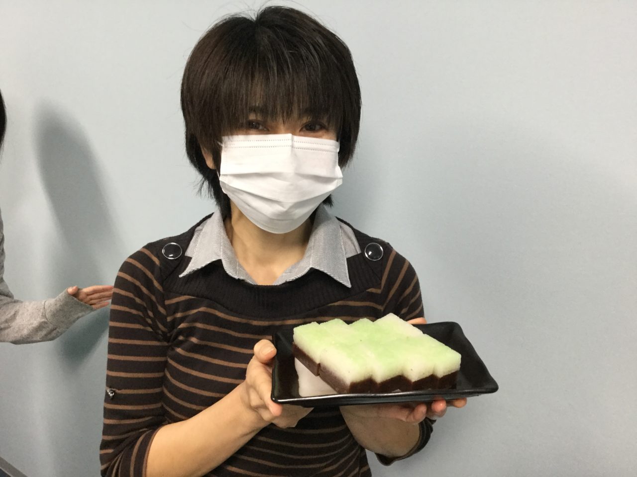初めて、作ってみたシークワーサーのしぐれ羊羹。I さんは、シークワーサーの果汁が入った道明寺粉の餅の部分を食べて「こざきねりのようだね。美味しい。」とおっしゃり、召し上がりました。