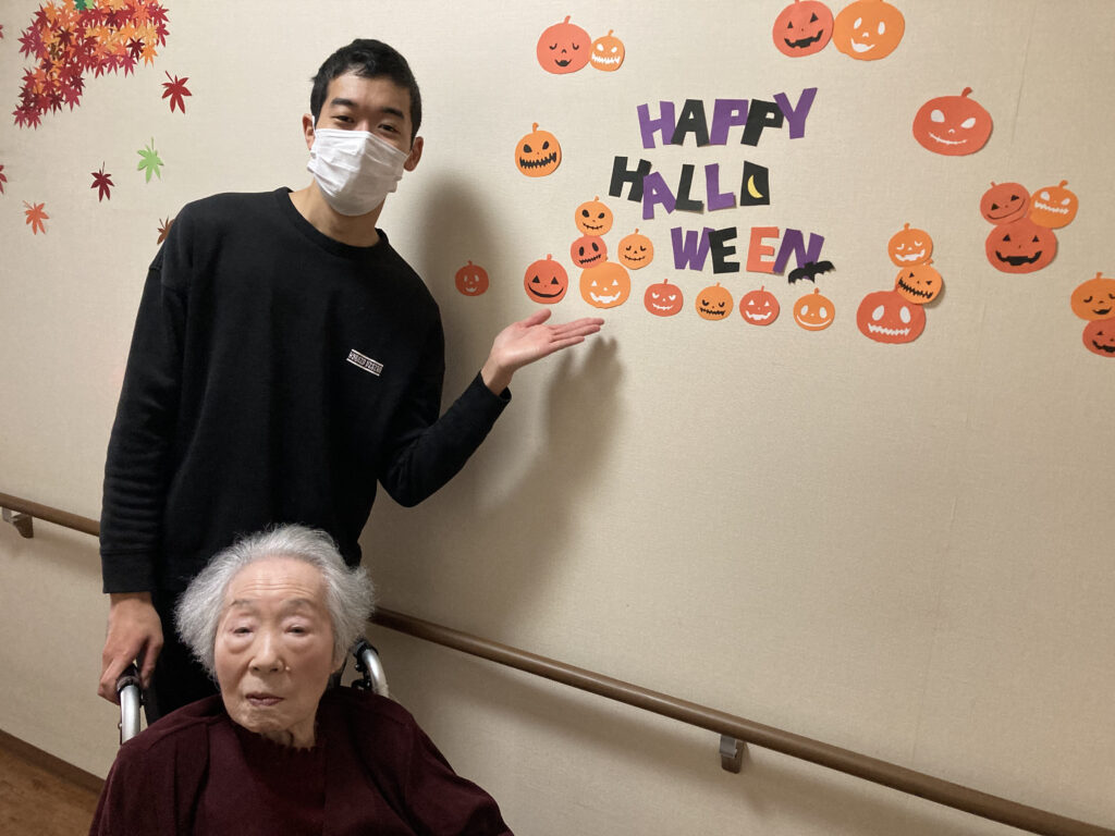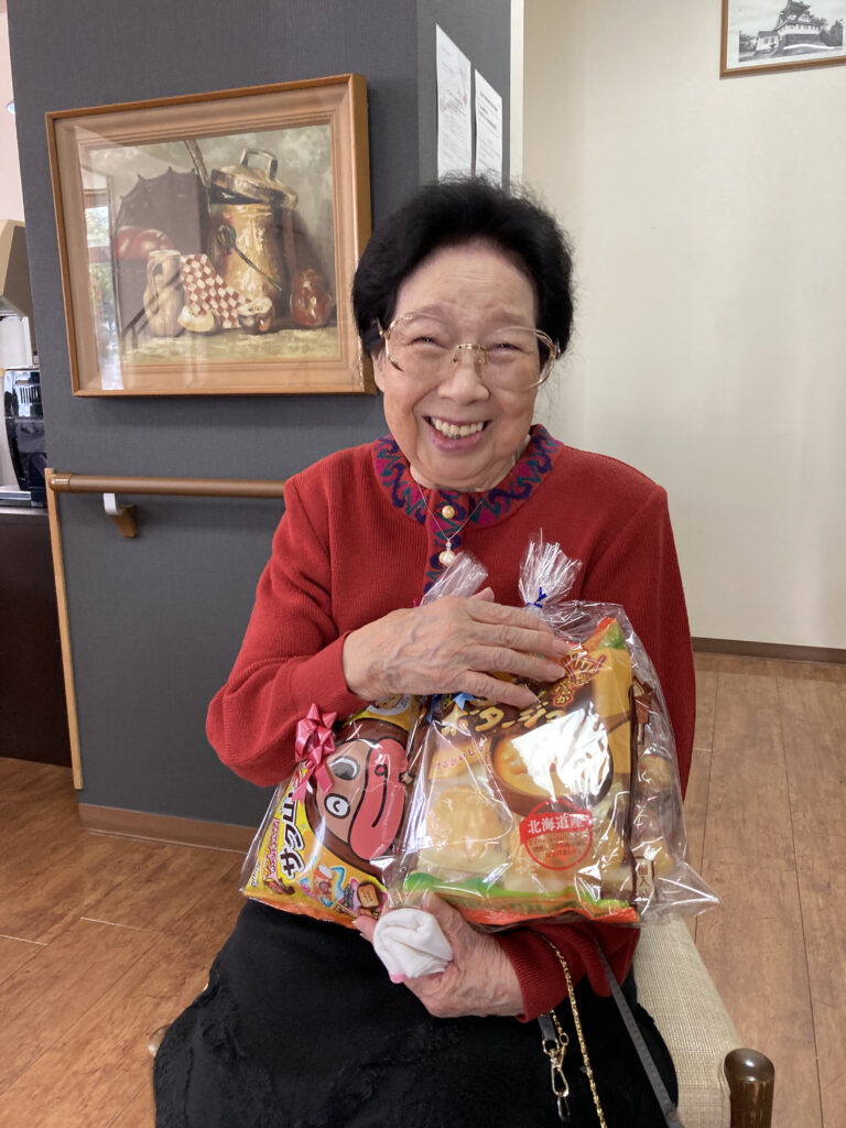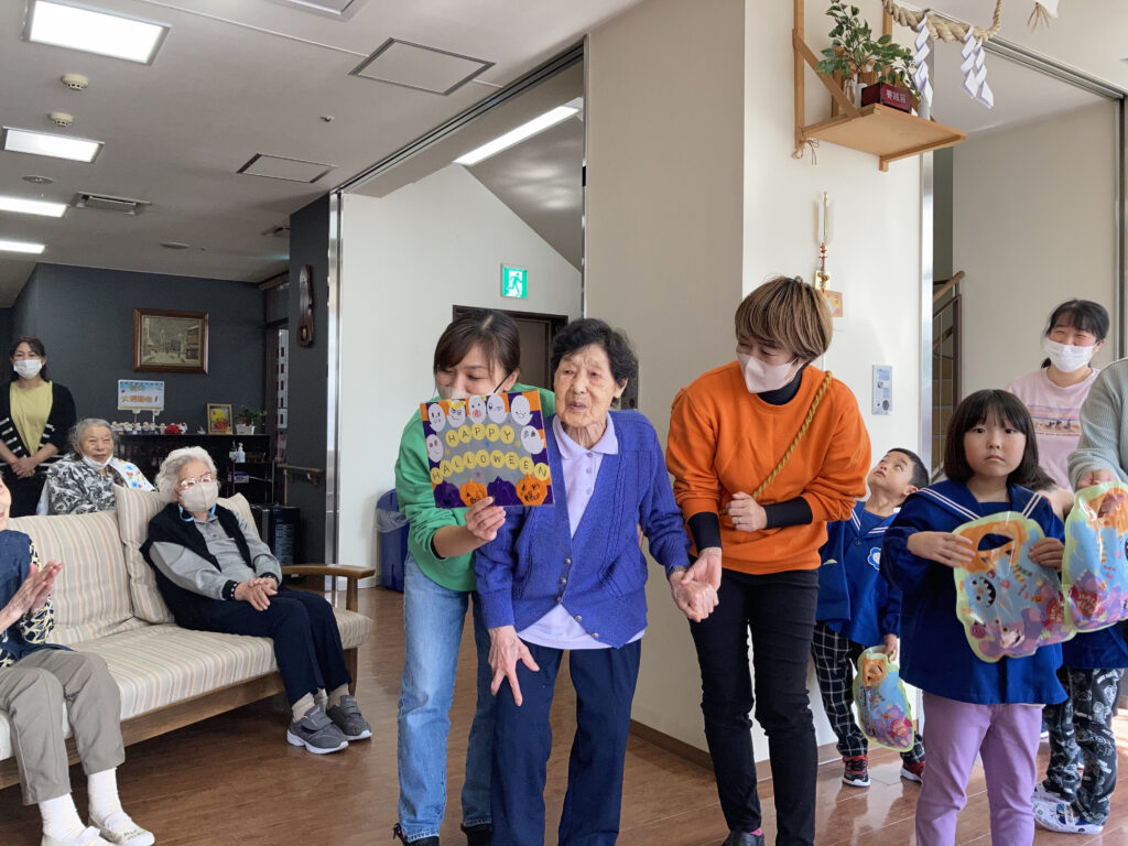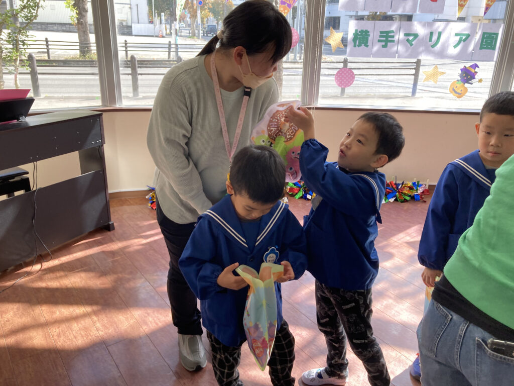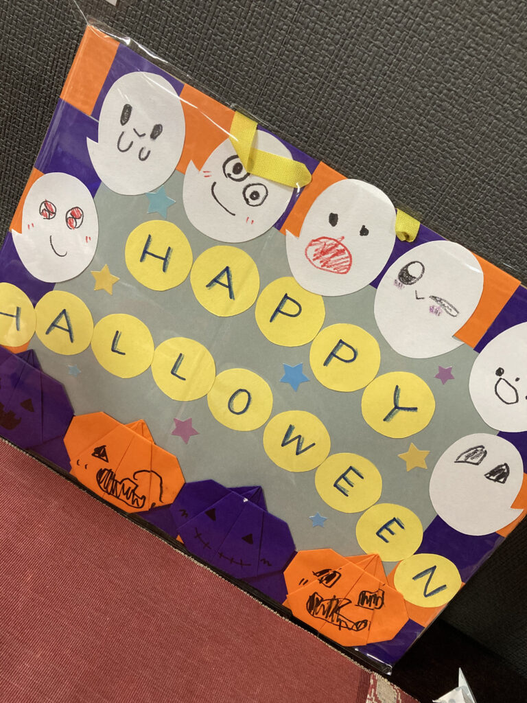 すると…マリア園の子供たちからもハロウィンの制作のプレゼントをいただきました!利用者さんを代表してTさんに受け取っていただきました!