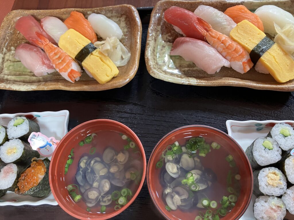 マグロ、鰤、サーモン、真鯛、ヤリイカ、蒸し海老、玉子、かっぱ巻き、ネギトロ巻き、納豆巻き、イクラ軍艦 😊おかわり付き💕