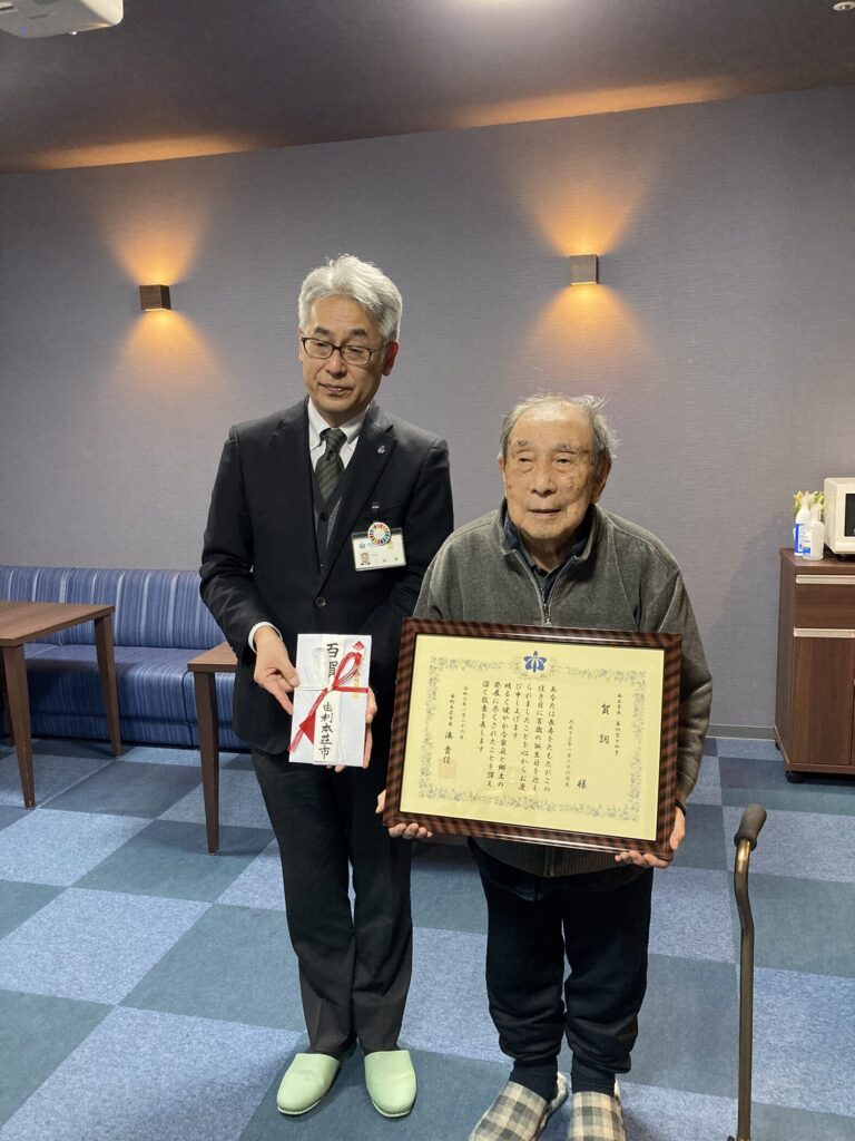 昨日は市役所から記念品の贈呈に職員の方がいらっしゃいました。