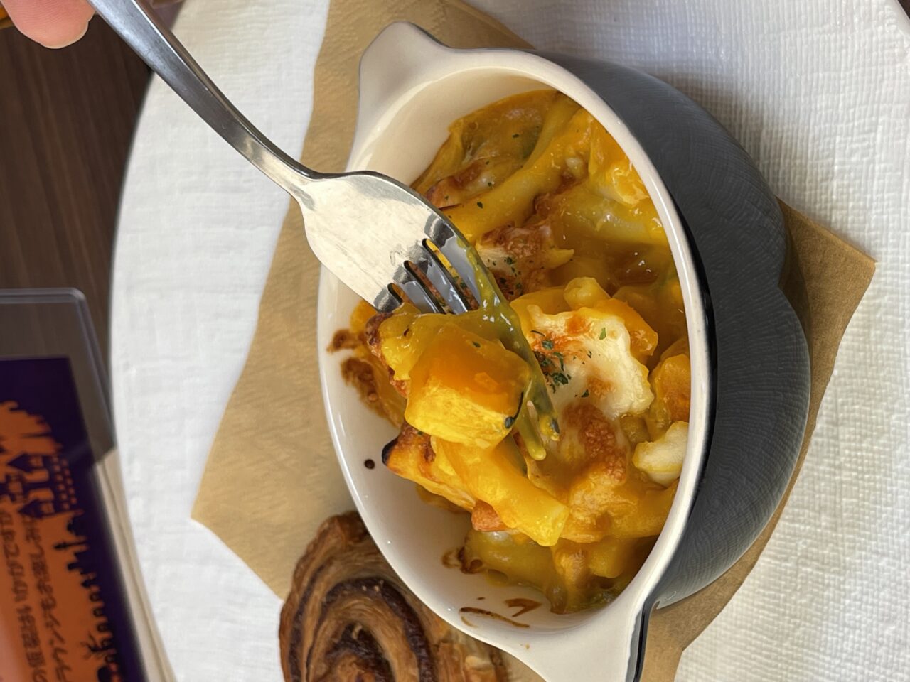 カボチャの風味に程よい味付けのマカロニグラタンをはじめとして、トリックオアトリート!とお菓子を想像させるような甘いクッキーをデザートにした、季節感あるメニューでした。