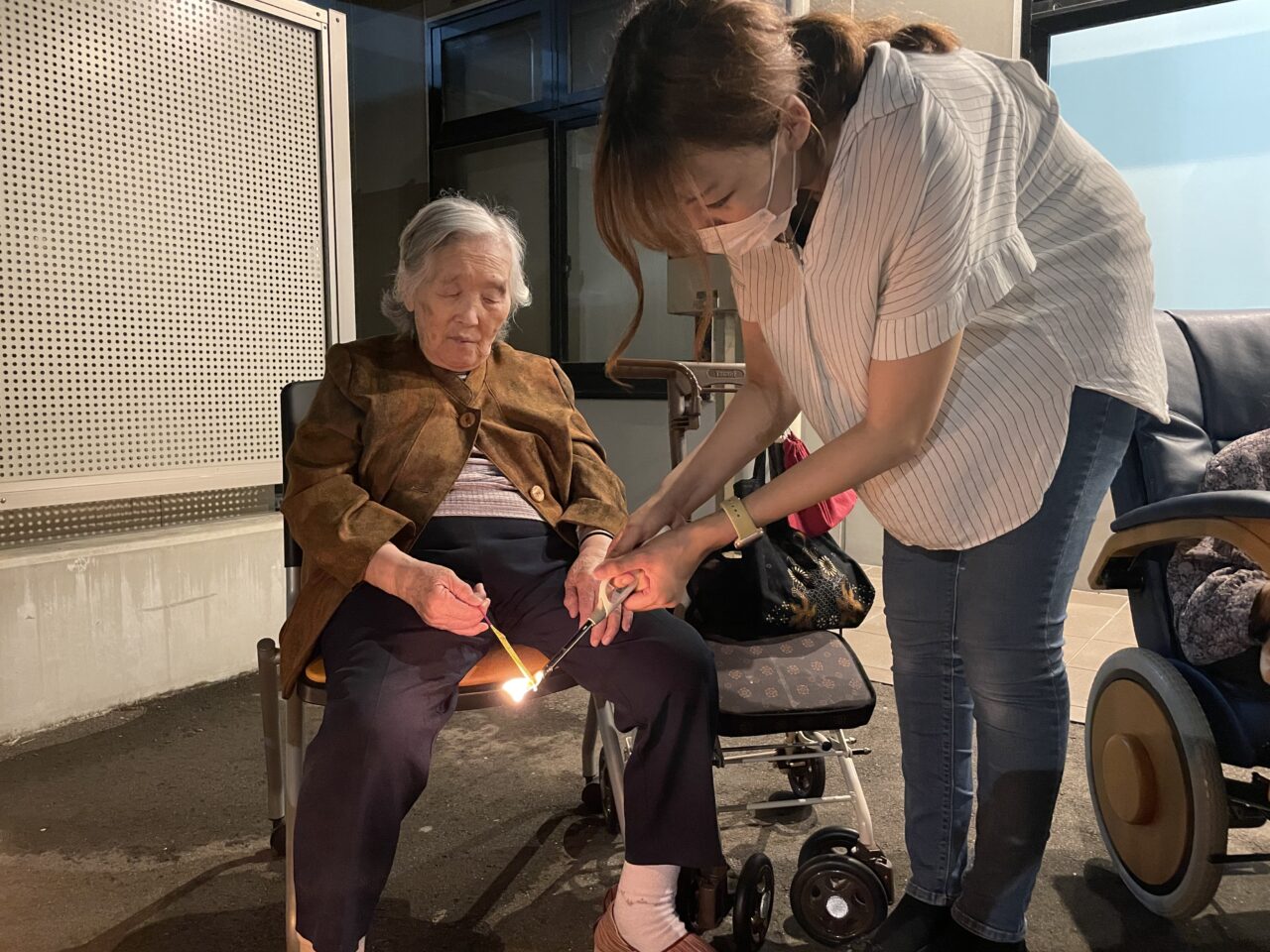 先日玄関前で行った納涼プチ花火の会の様子をお伝えします?