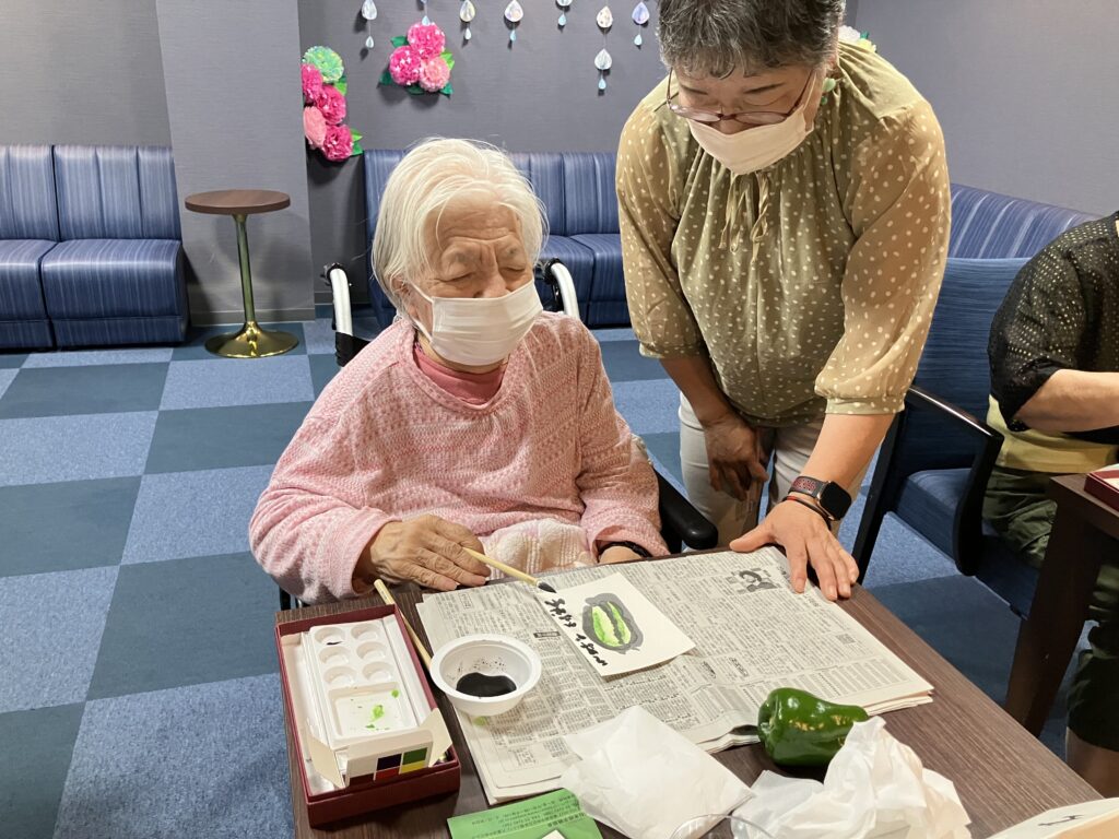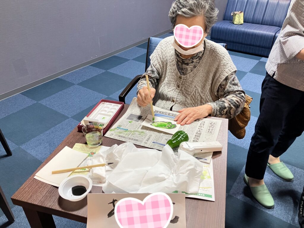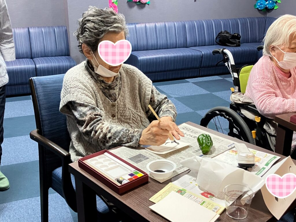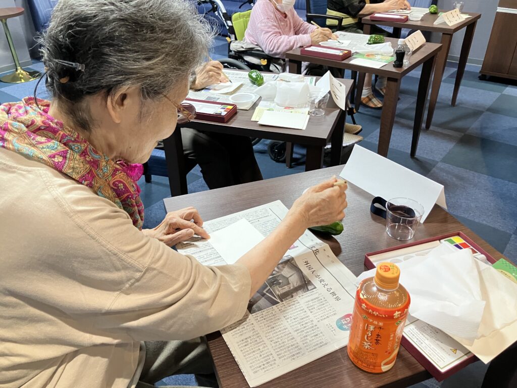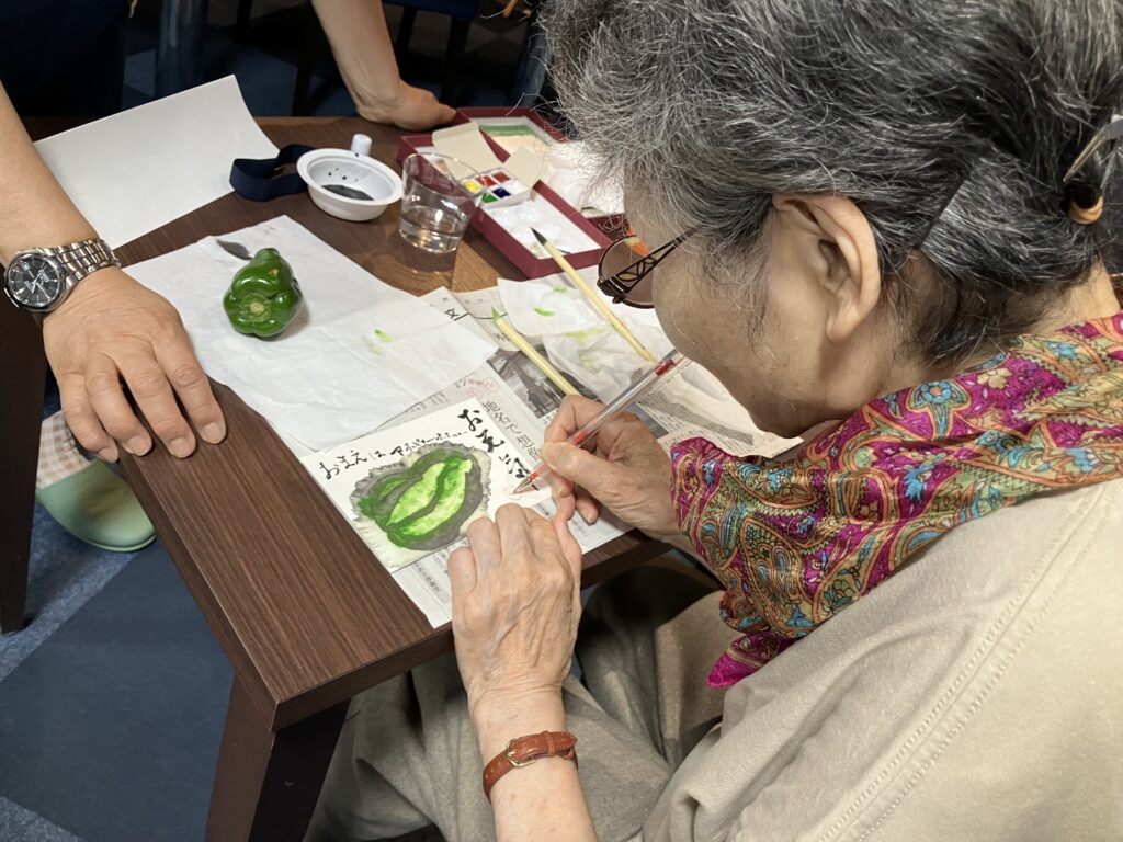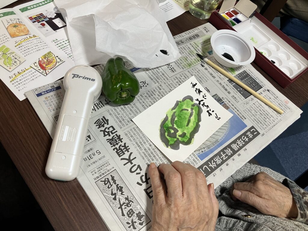 「ピーマンのどこが描いて欲しいと言っているか考えて描いてみましょう!」と先生からお話しがあり、皆さん真剣に取り組んでおりました。
