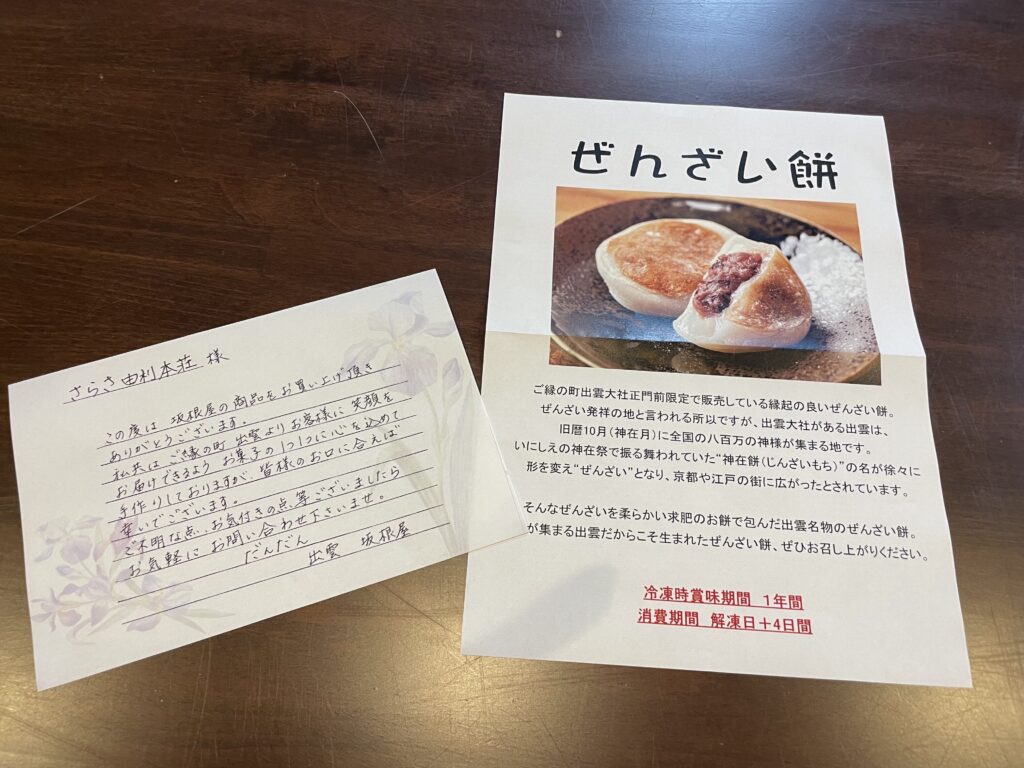 一緒にお茶を頂きながら、「47都道府県一か所だけを除いて他は全部行った事あるんだよ。出雲にも行ったけど、これ(ぜんざい餅)は食べなかったなあ。出雲そばを食べた記憶はあるよ。」と思い出話を聞かせて下さいました🌷