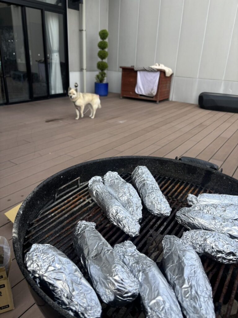 思い付きなので当然芋はないので今野パートナーに早速さつまいも、そして炭を買って来てもらい、お昼ご飯の落ち着いた頃にさっそく火を起こして焼き芋の準備を始めました!