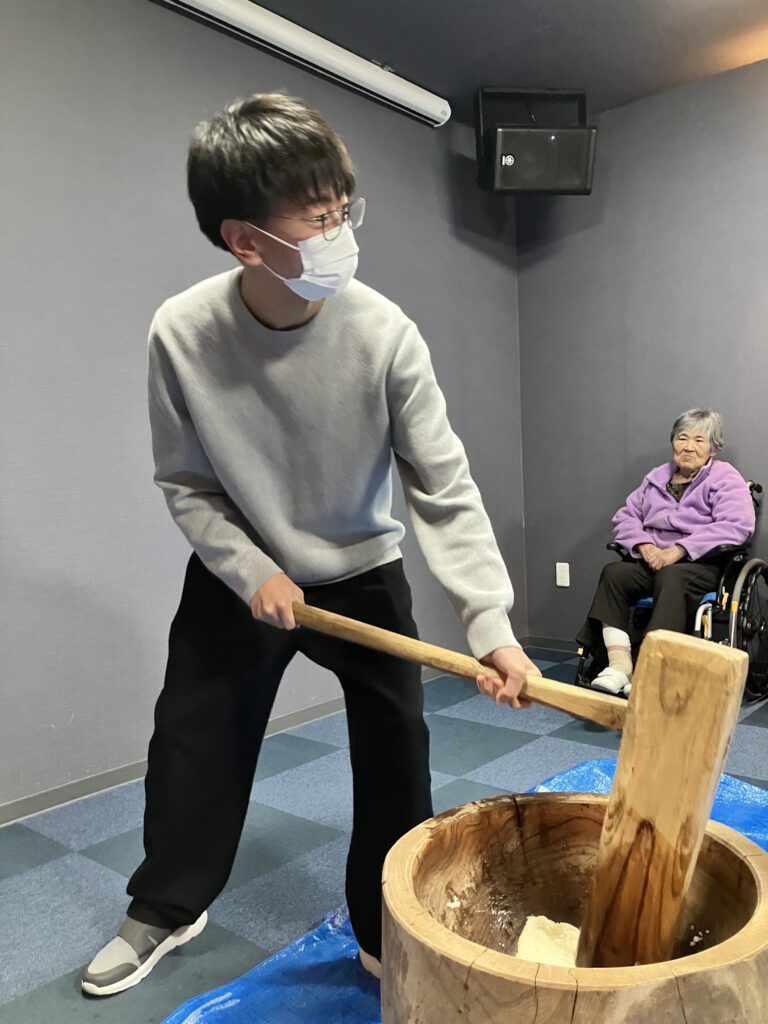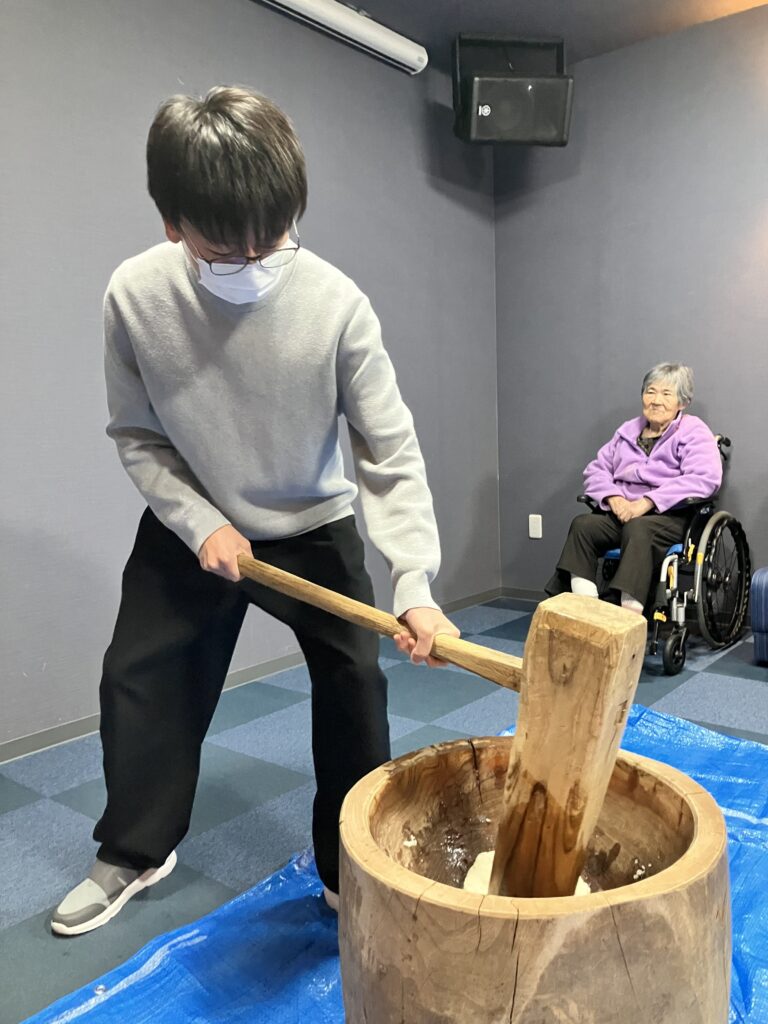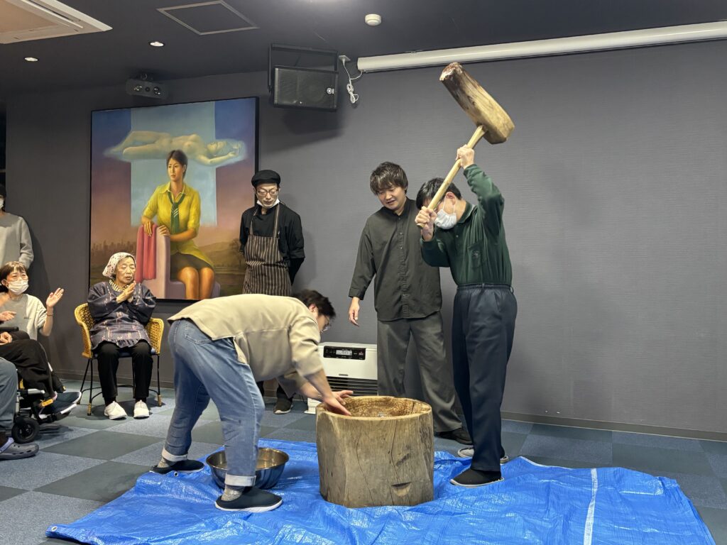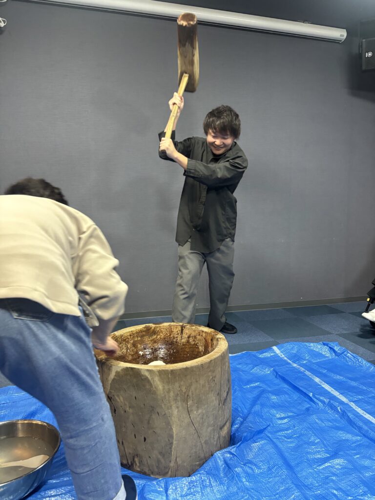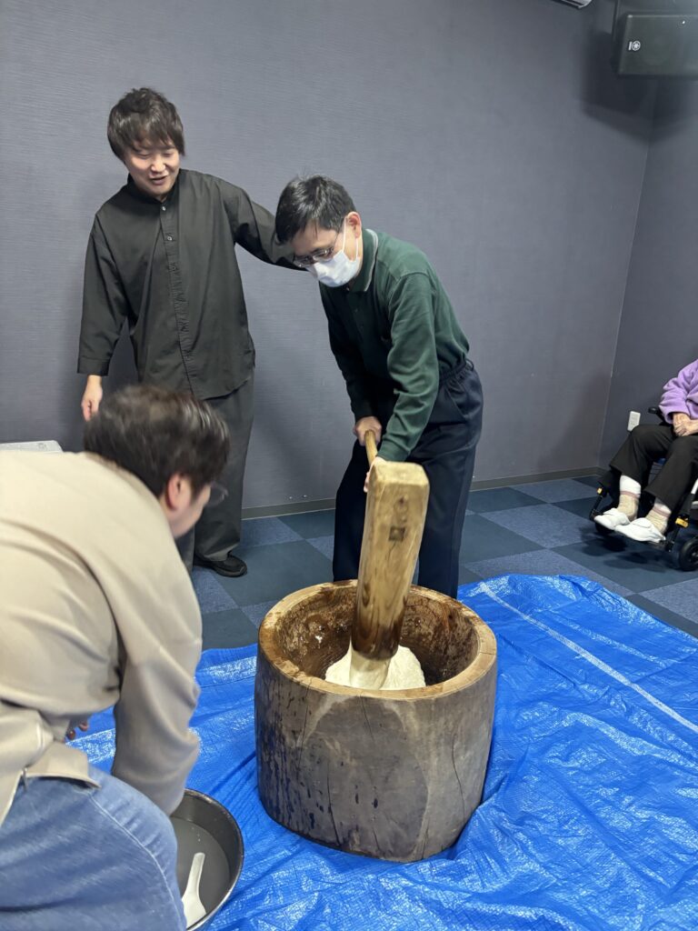 まずはみんなで杵(きね)と臼(うす)を囲んで、掛け声に合わせて「よいしょ!よいしょ!」とお餅つき🎶🎶