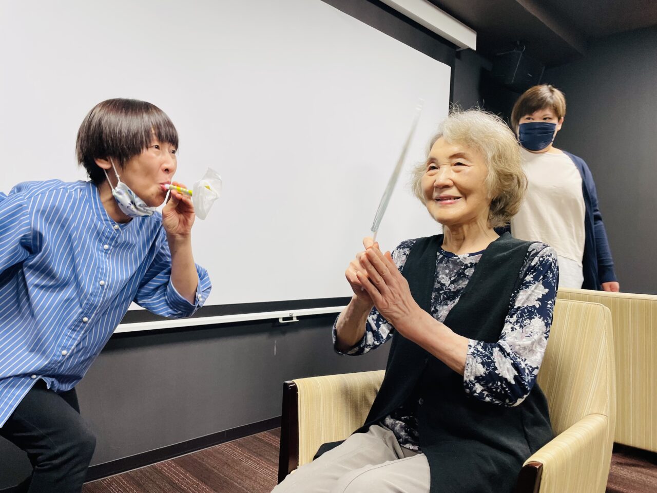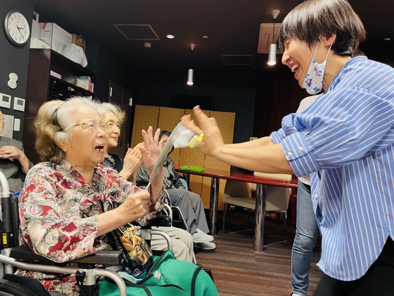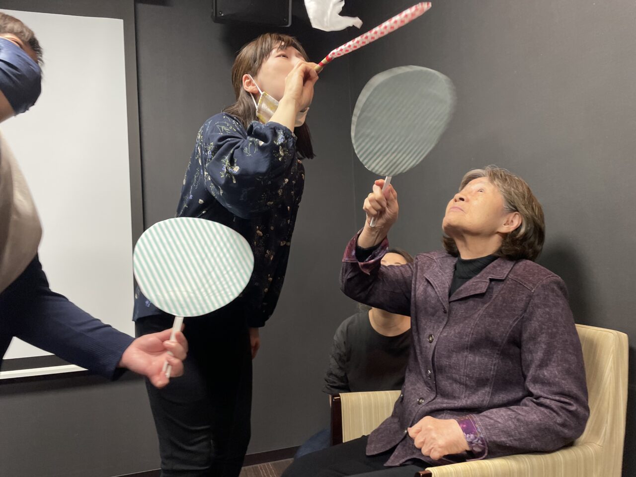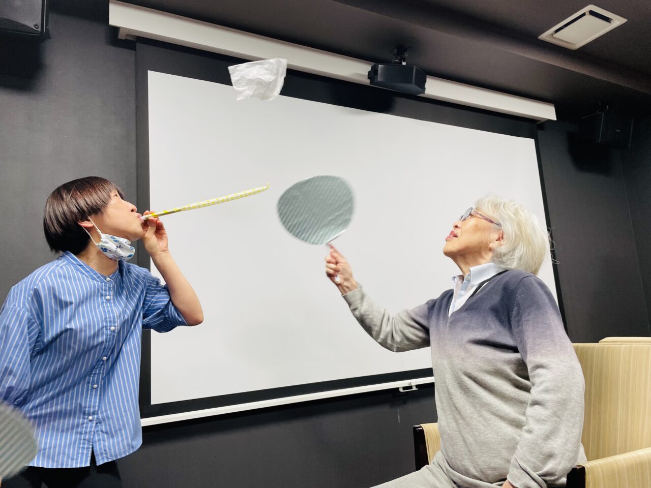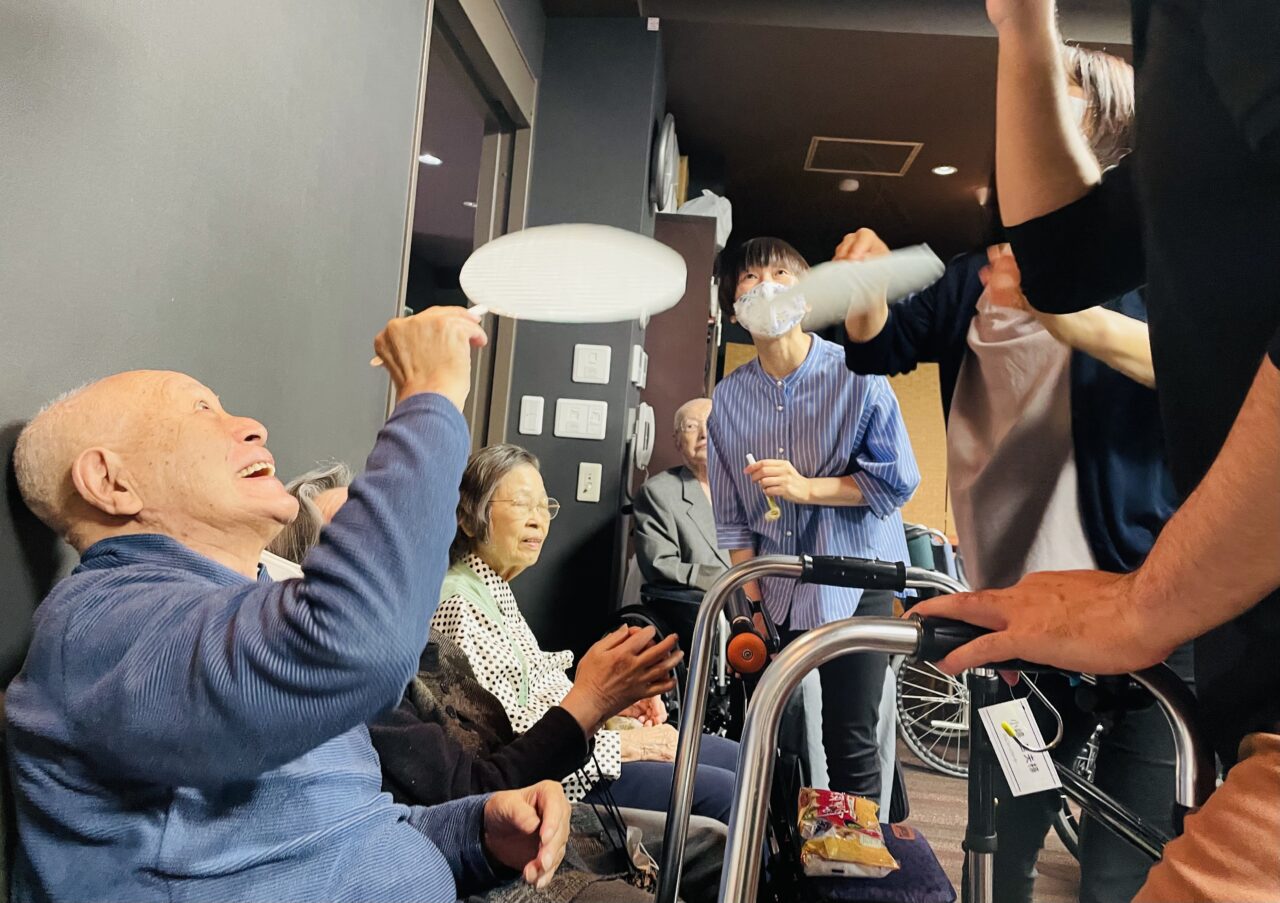 職員、ご利用者共に大盛り上がりのようですね😆💕ティッシュを懸命に煽ぐご利用者と、息を切らしながら『吹き戻し』を吹いている職員、お互いの息がピッタリ合った時の最後のキャッチ!!!素晴らしい連携プレー💪特にSさんと公恵パートナーの笑顔が輝いていますね✨