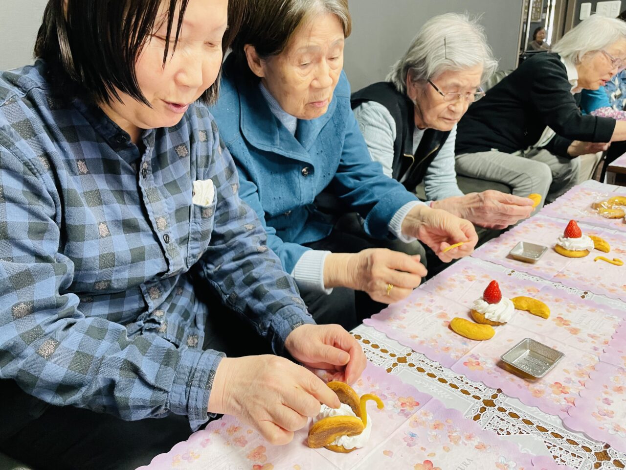 シューの生地はちょっとの分量の違いで膨らまなかったり、硬くなったりと朝からてんやわんやでしたが、美味しそうに召し上がっておられる、利用者さんの顔を見て苦労が一気に吹っ飛びました?