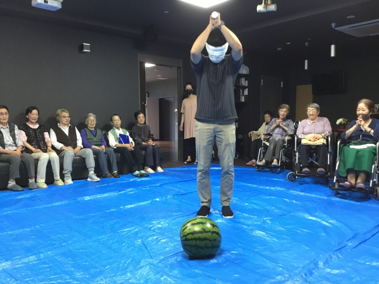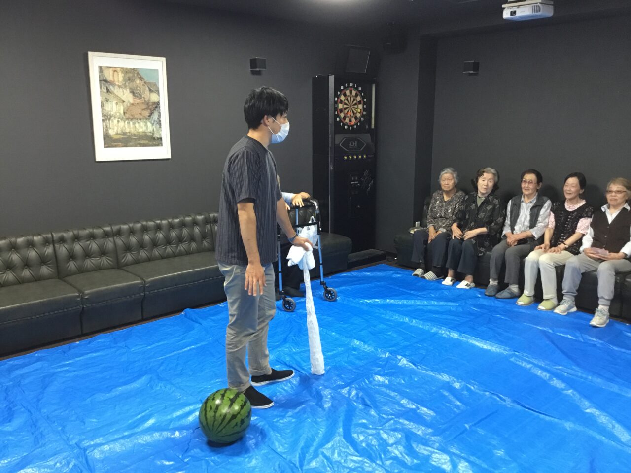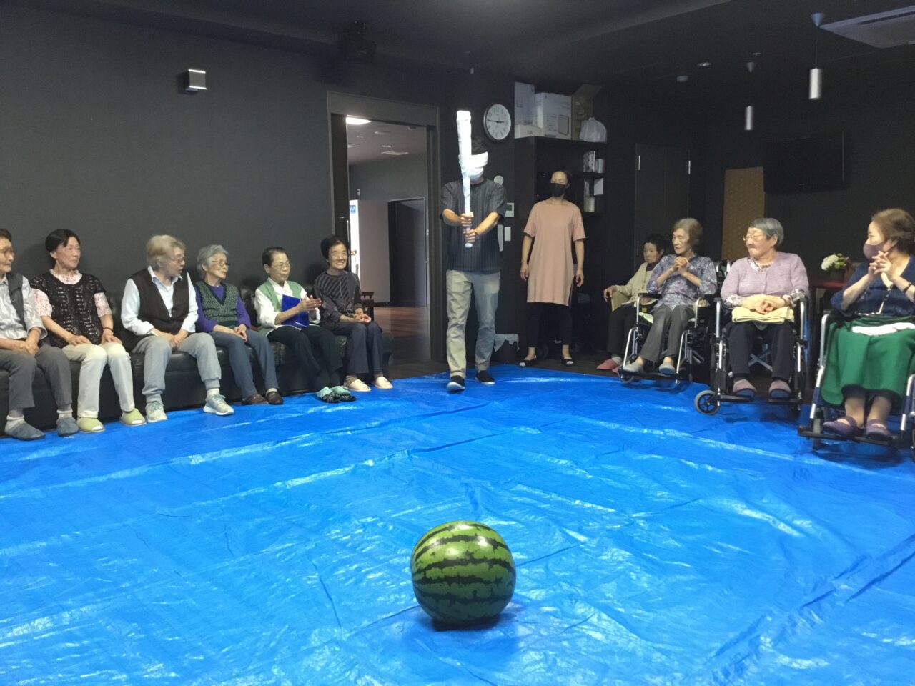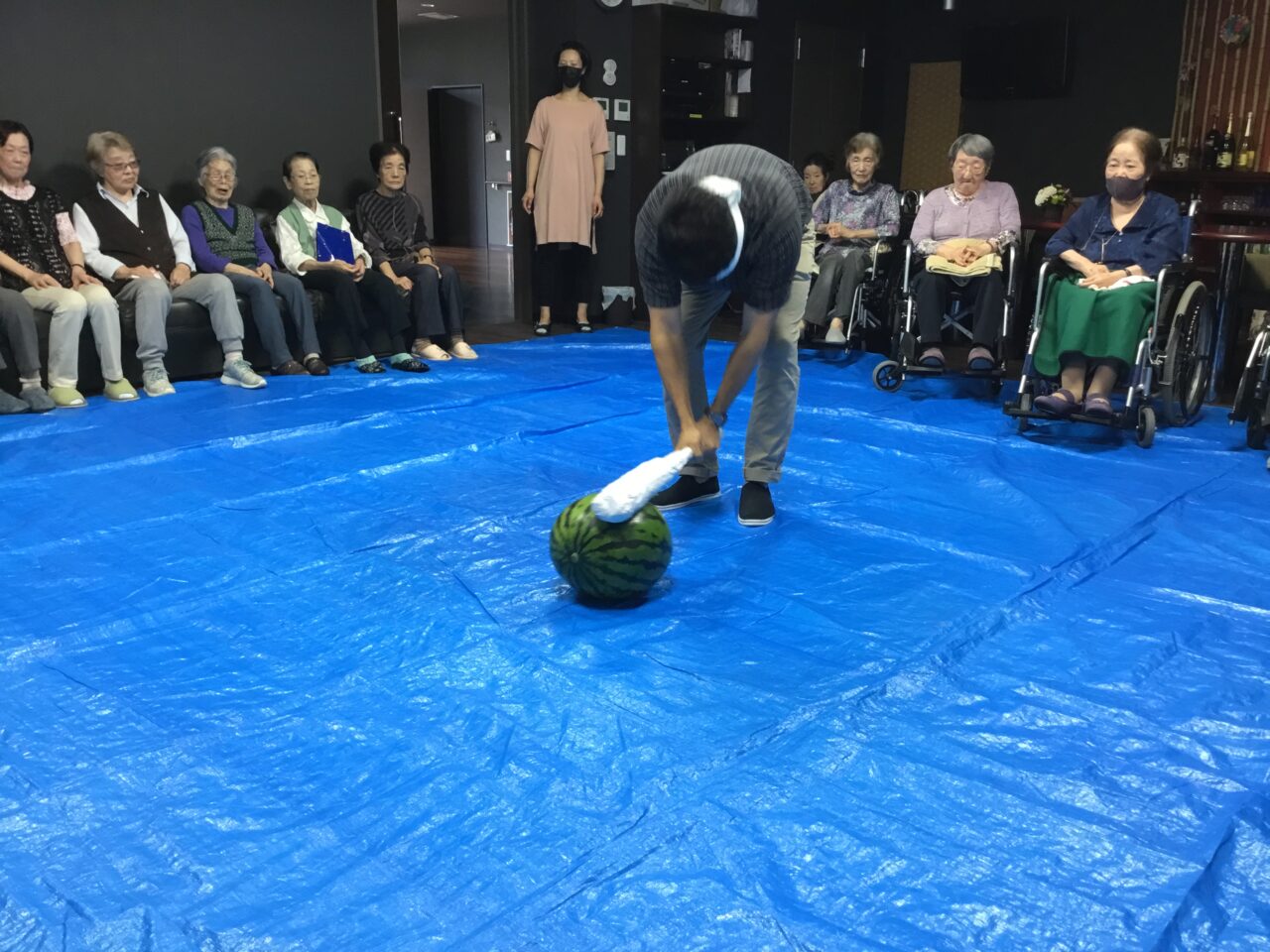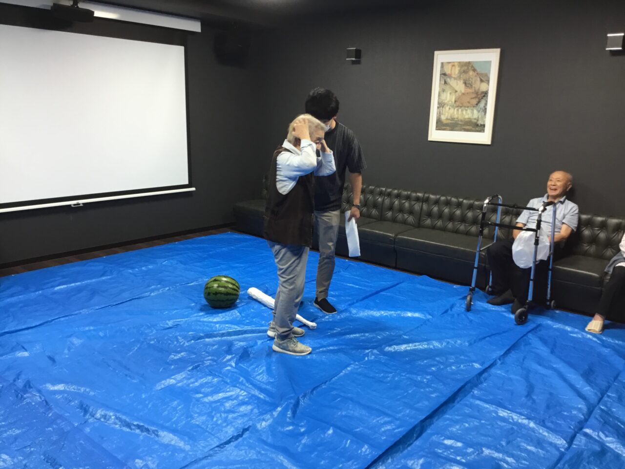 立派なスイカを用意し、スイカ割りを楽しんで頂きました?