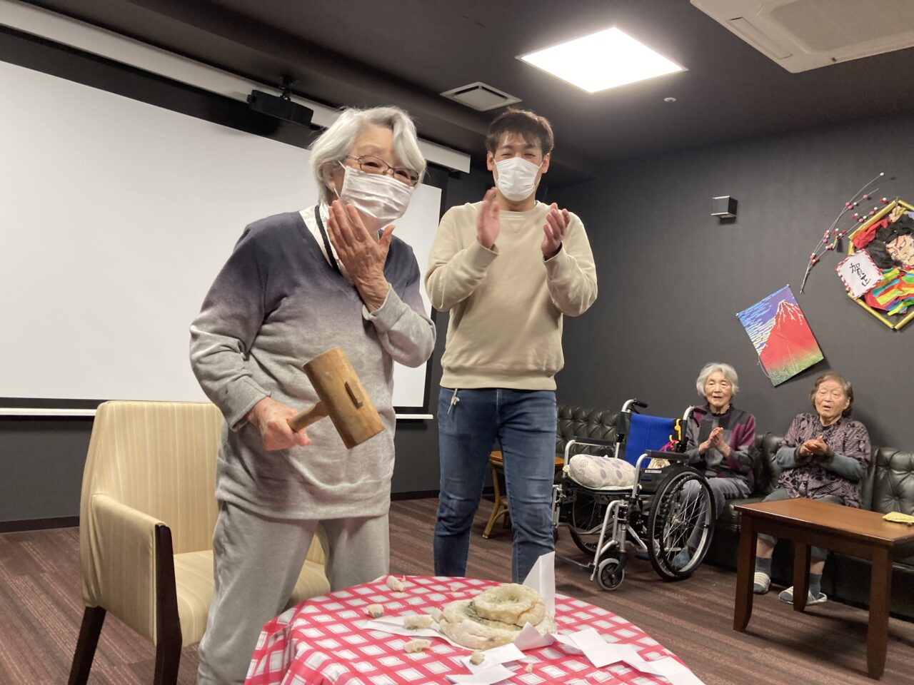 始め、貴裕貴パートナーが冗談で杵を渡すとMさんはビックリ‼️