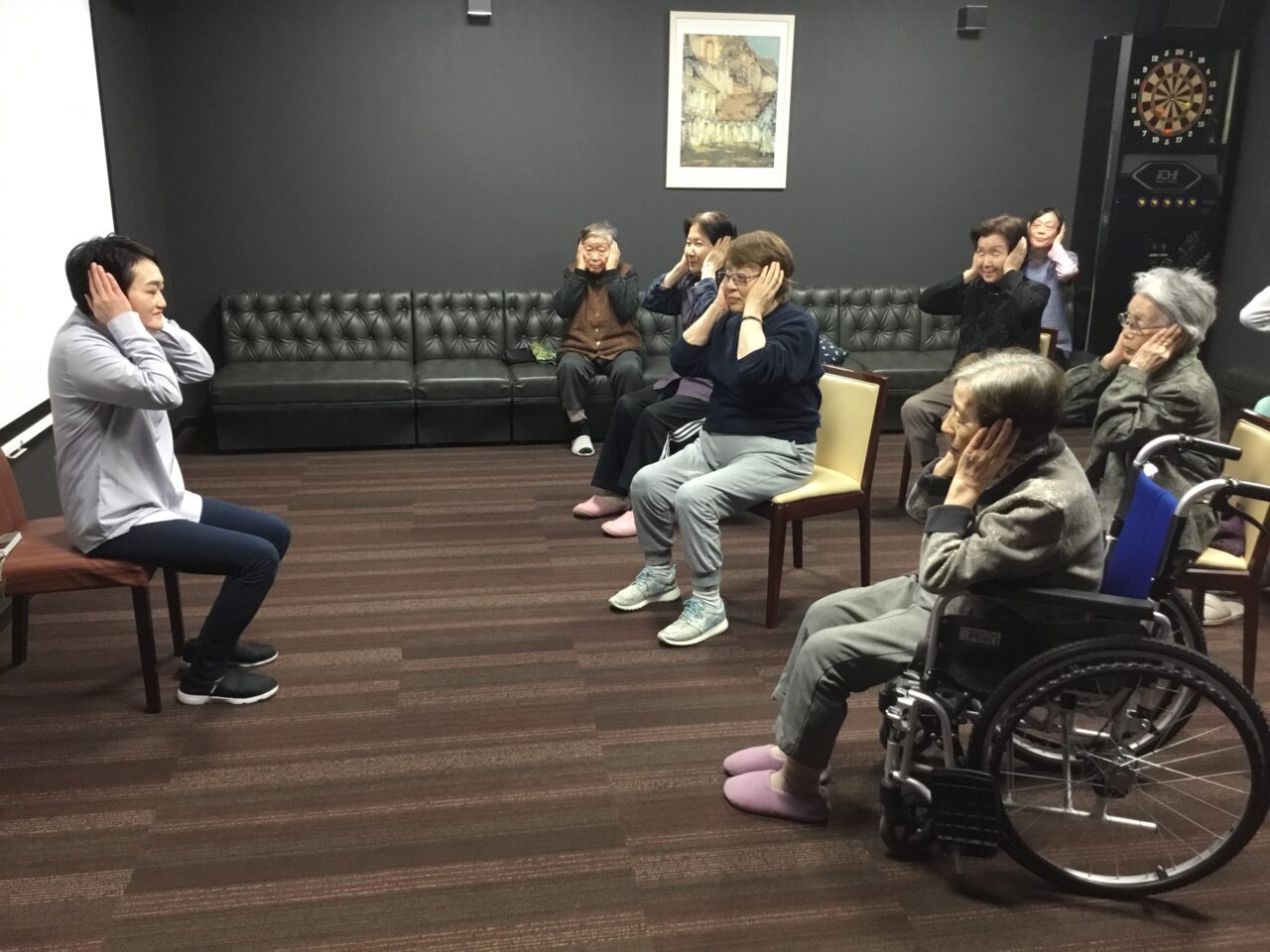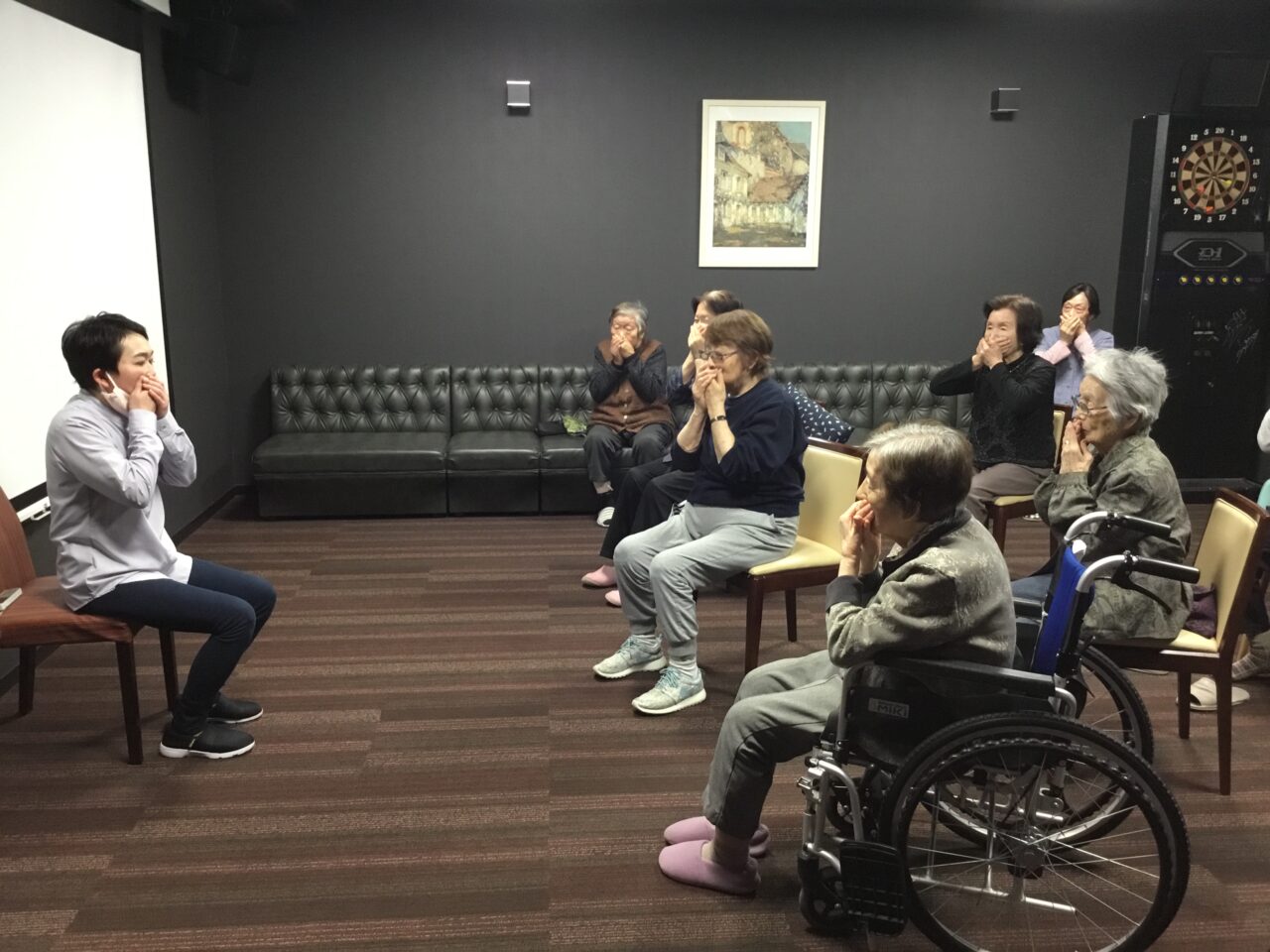 言葉に合わせたジェスチャーをしてもらう脳トレです。皆さんなかなか筋が良いです?