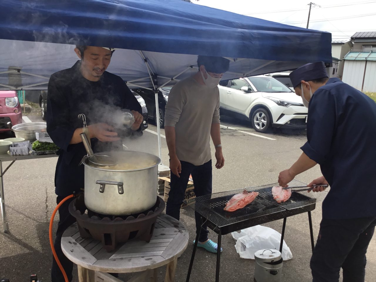 外では塩むすびとぼだっこ焼き、そして芋の子汁作りです?