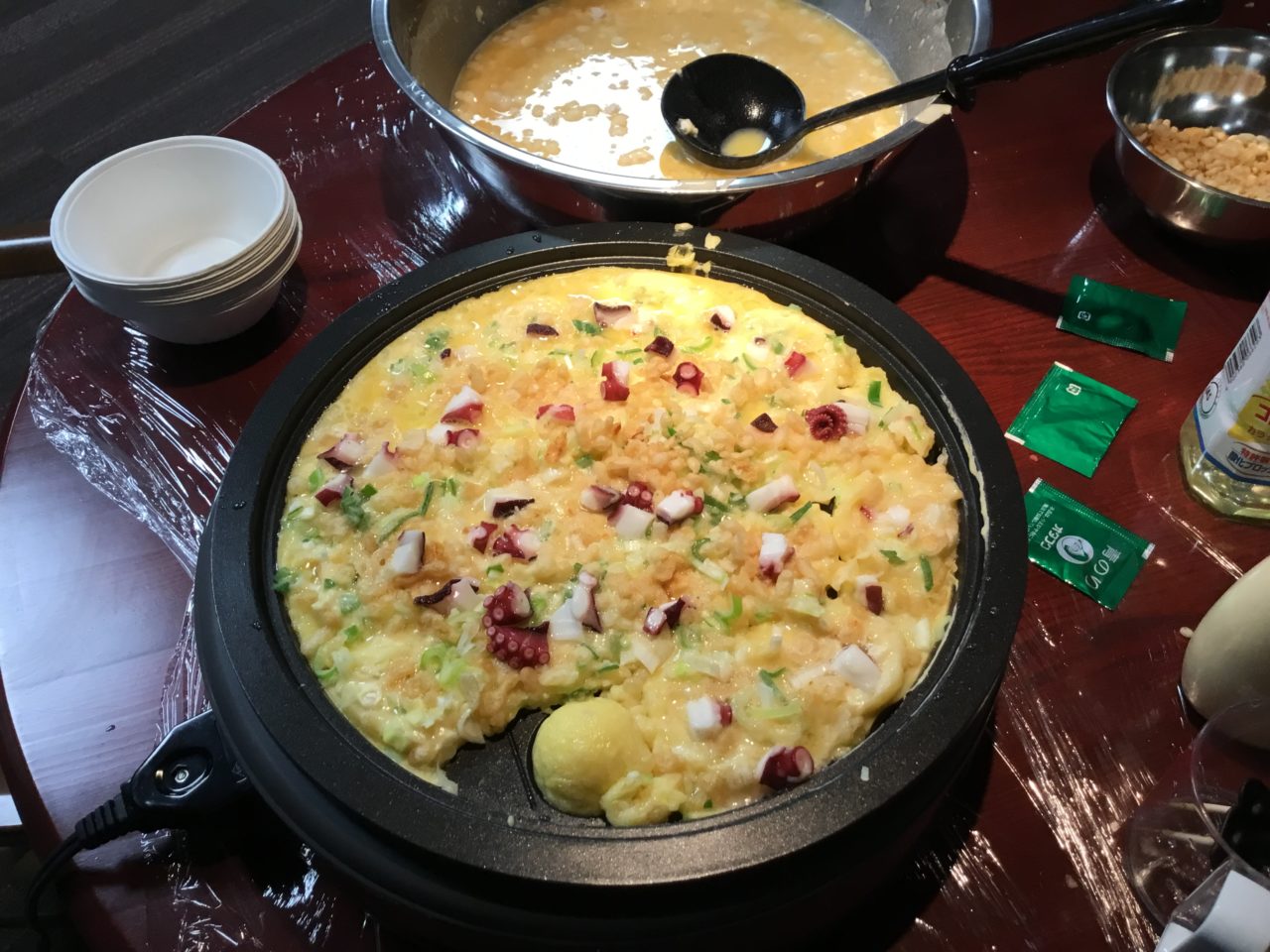 皆さんで作っていただくネギたっぷりなたこ焼きいいですね✨