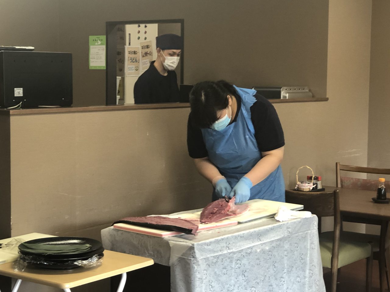 艶のある立派な鰤を、見事にさばいていきます?その様子にご利用者さんも釘付けです?