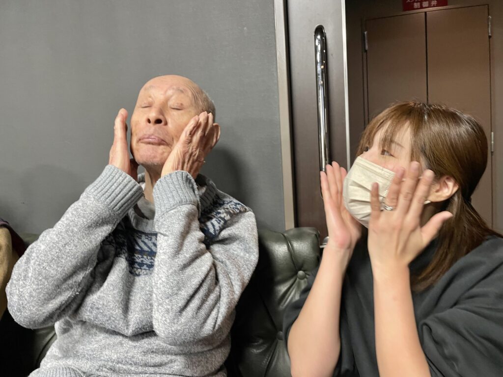 「洗顔はぬるま湯で優しく、優しく〜」と、野口パートナーの声に、「こうだが?」と、Tさん♡