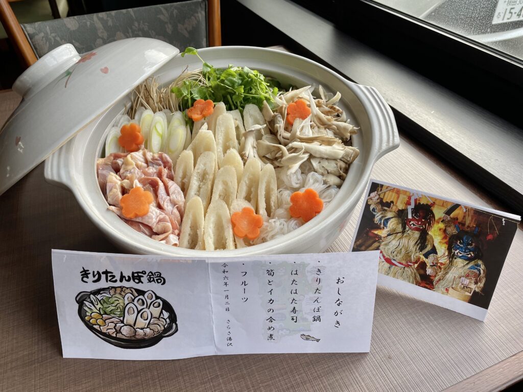 秋田の郷土料理きりたんぽ鍋?に、ハタハタ寿司?です‼️