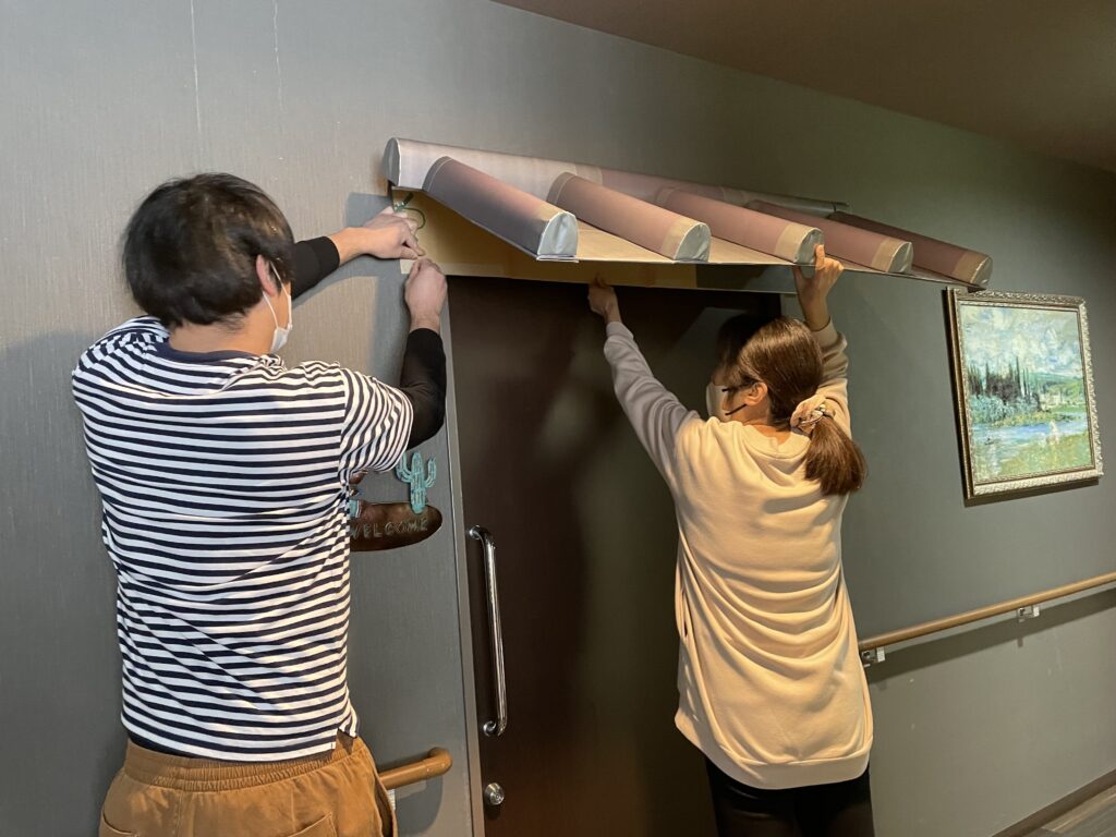 んっ!?ラウンジの扉に屋根を取り付けているではありませんか?!!
