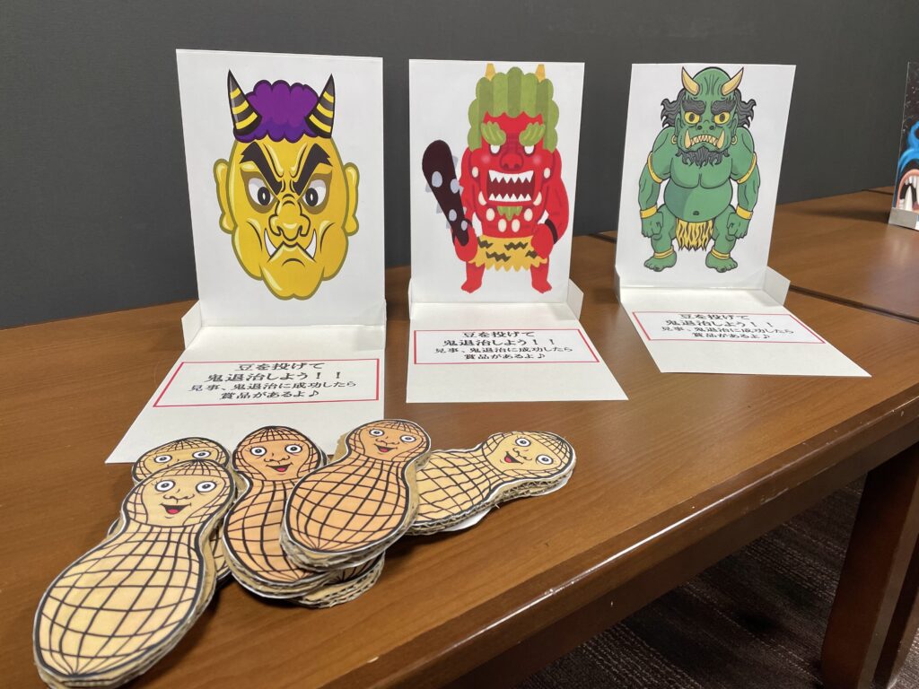 最初にみなさんが向かわられた場所は鬼の的倒しコーナーです❗️可愛い巨大落花生で的を倒して行きます❗️『鬼は外〜福は内〜』豆まきで邪気を払います✨