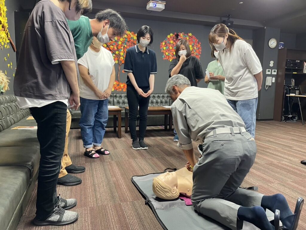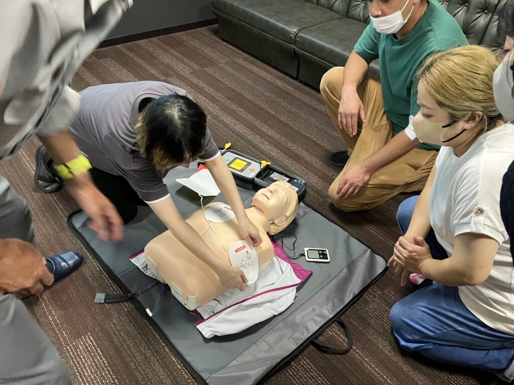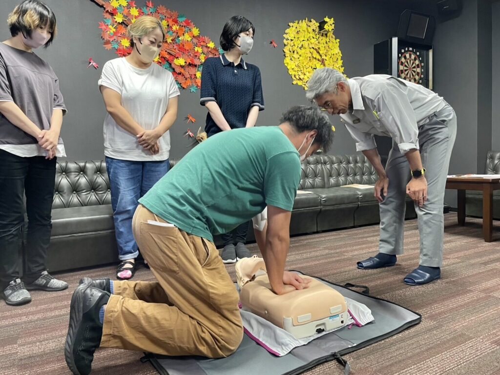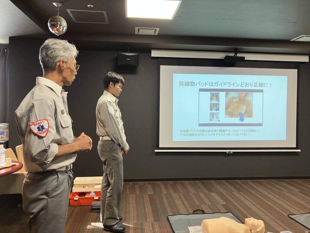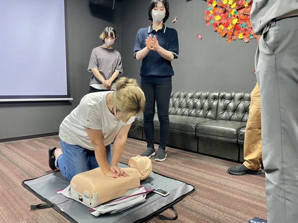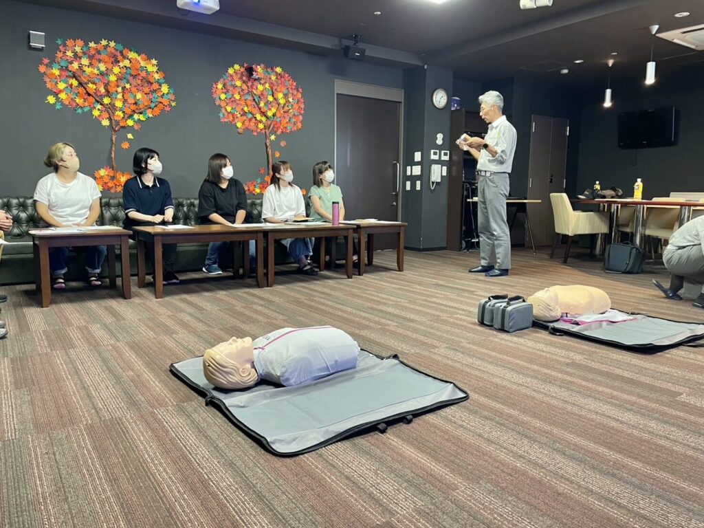 研修の一環として、今年も消防署の方にお越し頂き、AED講習会を実施🍁